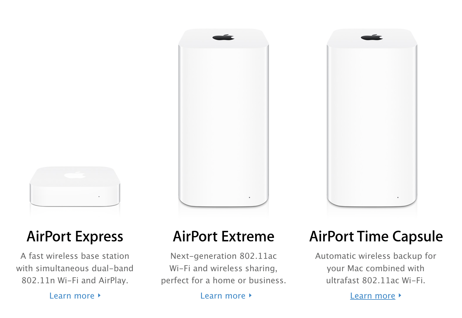苹果在约15年时间里发布了额外的AirPort型号。产品线包括一个低端版本称为AirPort Express和一个高端型号名为AirPort Extreme,以及AirPort Time Capsule,该产品在路由器中嵌入了硬盘,用于无线Mac备份。