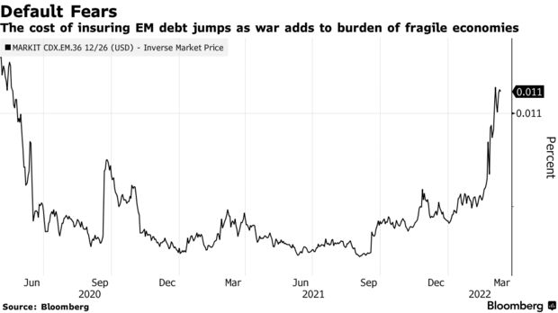 一些世界上最脆弱国家的债务市场正在发出警告信号,乌克兰冲突给脆弱经济增加了压力。担心俄罗斯本月是否会履行利息支付义务,导致投资者开始考虑谁还有可能无法支付。