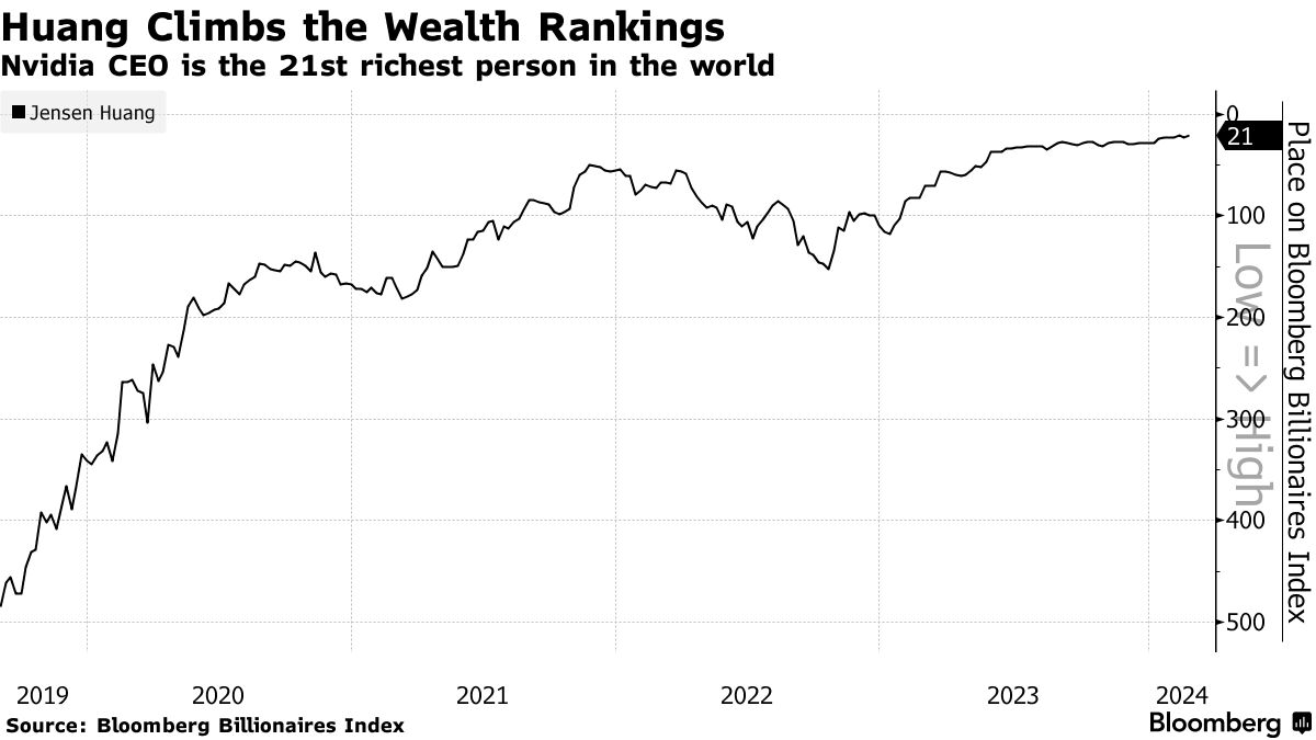 周四,黄仁勋的财富增加了96亿美元,达到692亿美元,这一增长让他超过查尔斯·科赫和中国瓶装水大亨钟睒睒,跃居彭博亿万富翁指数的第21位。对于这家半导体公司的联合创始人来说,这是一个非凡的崛起,仅在去年初还排名第128位,净资产为135亿美元。