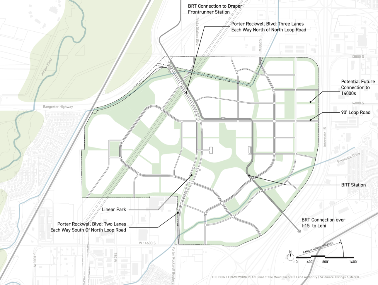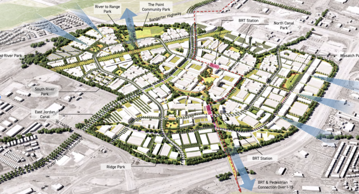 “The Point”开发商计划在盐湖城和普罗沃之间的犹他州郊区建设一个总体规划社区,他们将自己的项目设想为一个“15分钟城市”:计划描述了一个生活与工作相结合的社区,拥有约7400个住宅单元和至少3万个工作岗位,所有这些都只需很短的步行距离即可到达学校、工作场所、零售店、餐馆和娱乐场所。