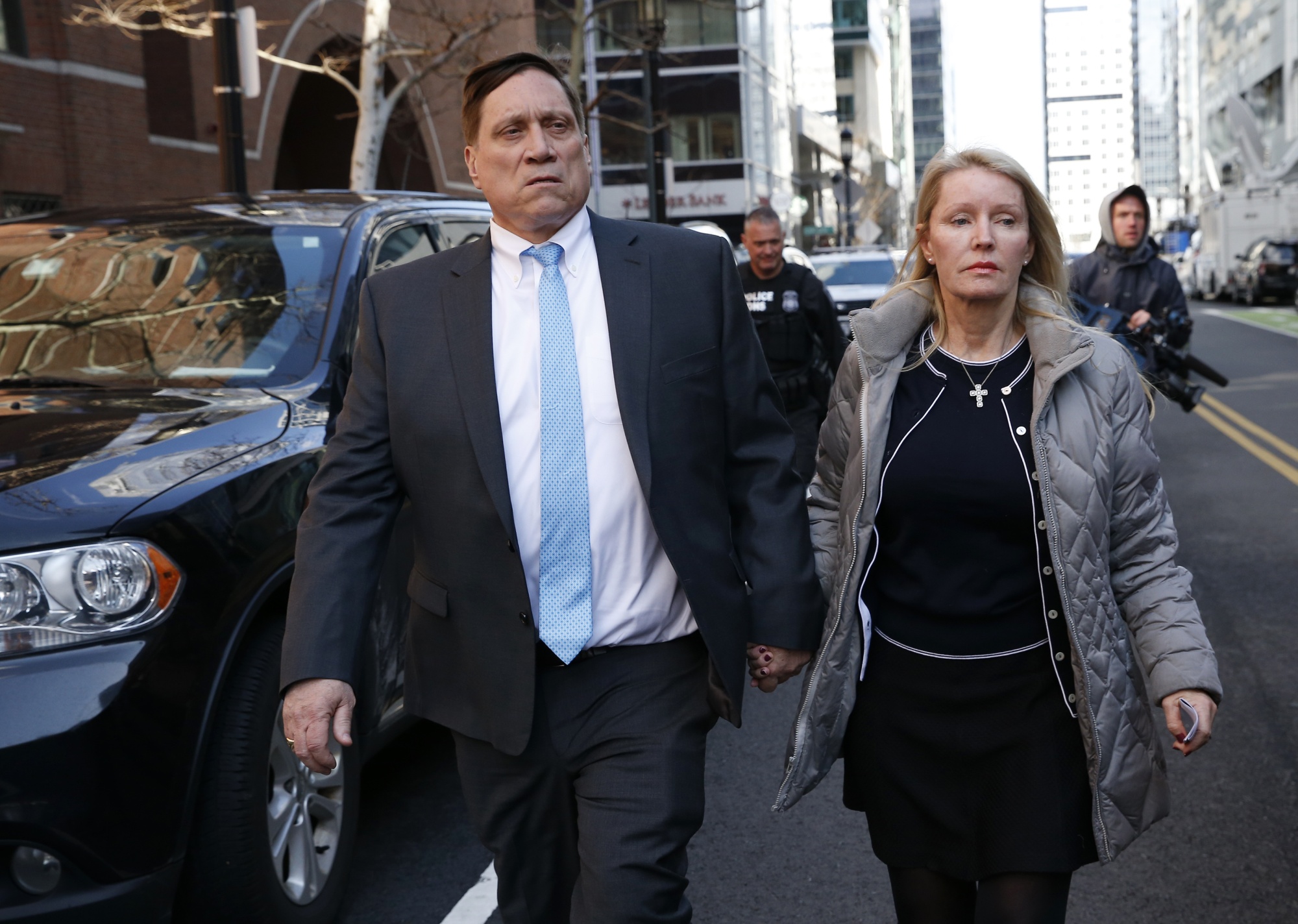 约翰·威尔逊(John Wilson)左,2019年4月3日离开波士顿联邦法院。摄影师:杰西卡·里纳尔迪(Jessica Rinaldi)/波士顿环球报/盖蒂图片社