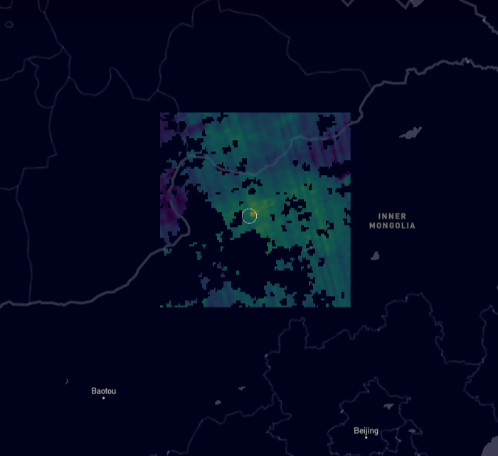 卫星在中国内蒙古蒙莱露天煤矿附近观测到的甲烷羽流。来源:Kayrros SAS