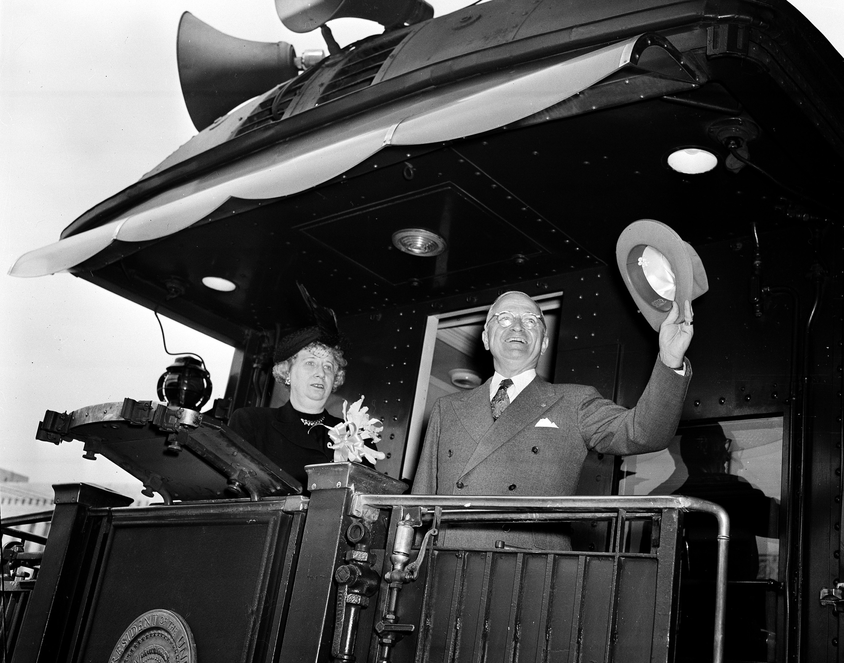美国总统哈里·S·杜鲁门和他的妻子贝丝于1948年10月6日乘坐特别总统列车“麦哲伦号”抵达费城。