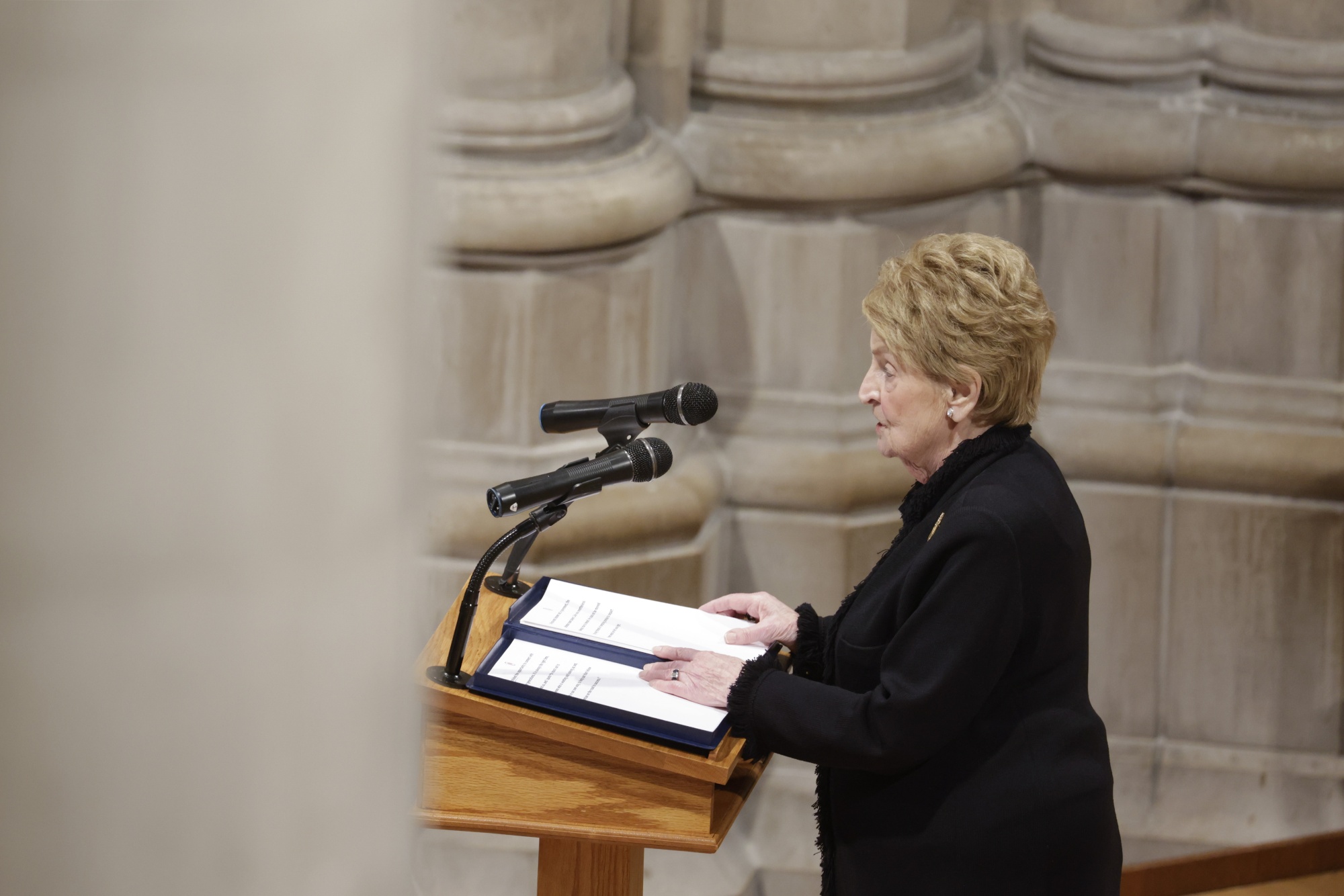 玛德琳·奥尔布赖特在2021年科林·鲍威尔葬礼上讲话。摄影师:塞缪尔·科伦/彭博社### 明天你需要知道的事情