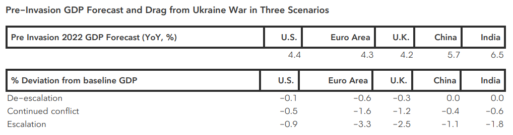 彭博经济学同时重新运行了其在俄罗斯入侵初期制定的三种情景,衡量了继续冲突或危机升级对主要经济体增长的打击,以及危机缓解的影响。