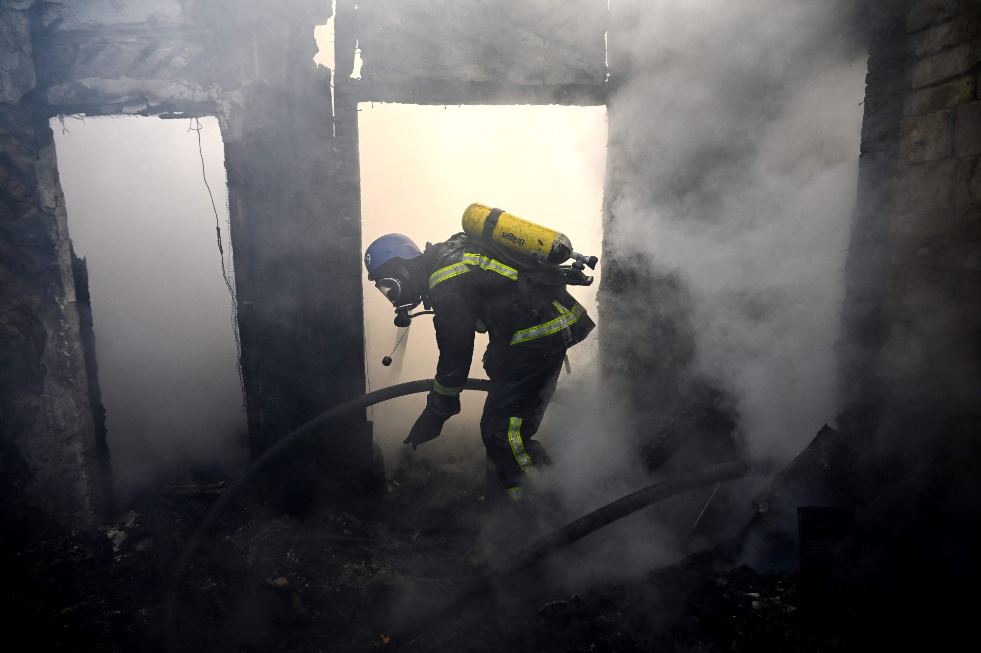 消防员在3月22日基辅一处房产上扑灭俄罗斯火箭袭击引发的火焰。