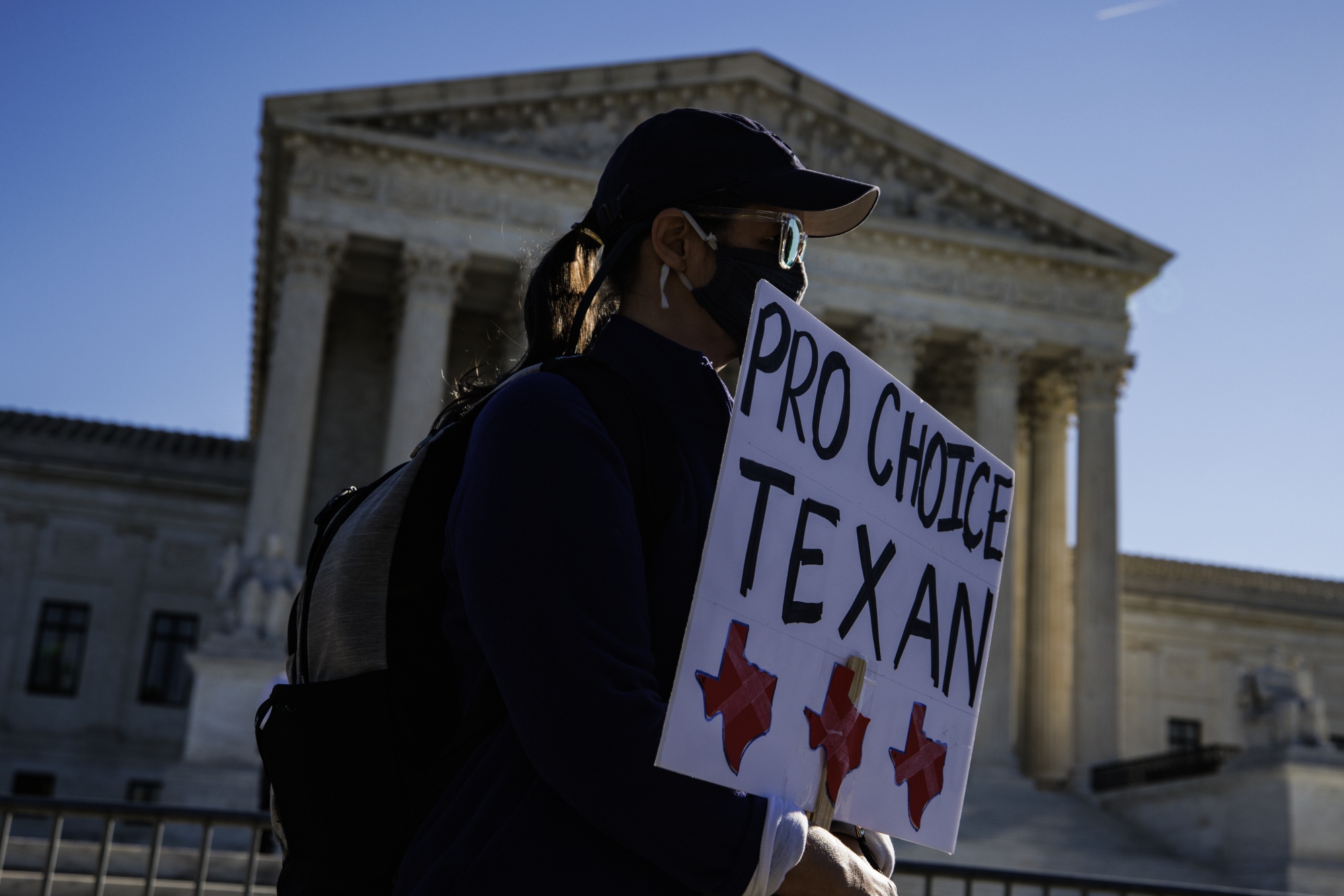 一名示威者在2021年11月在华盛顿特区的美国最高法院外举着标语。摄影师:Samuel Corum/Bloomberg