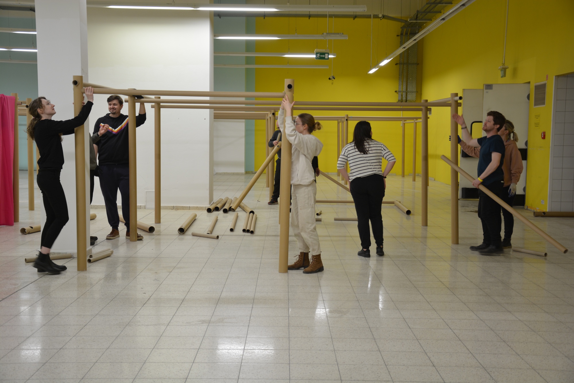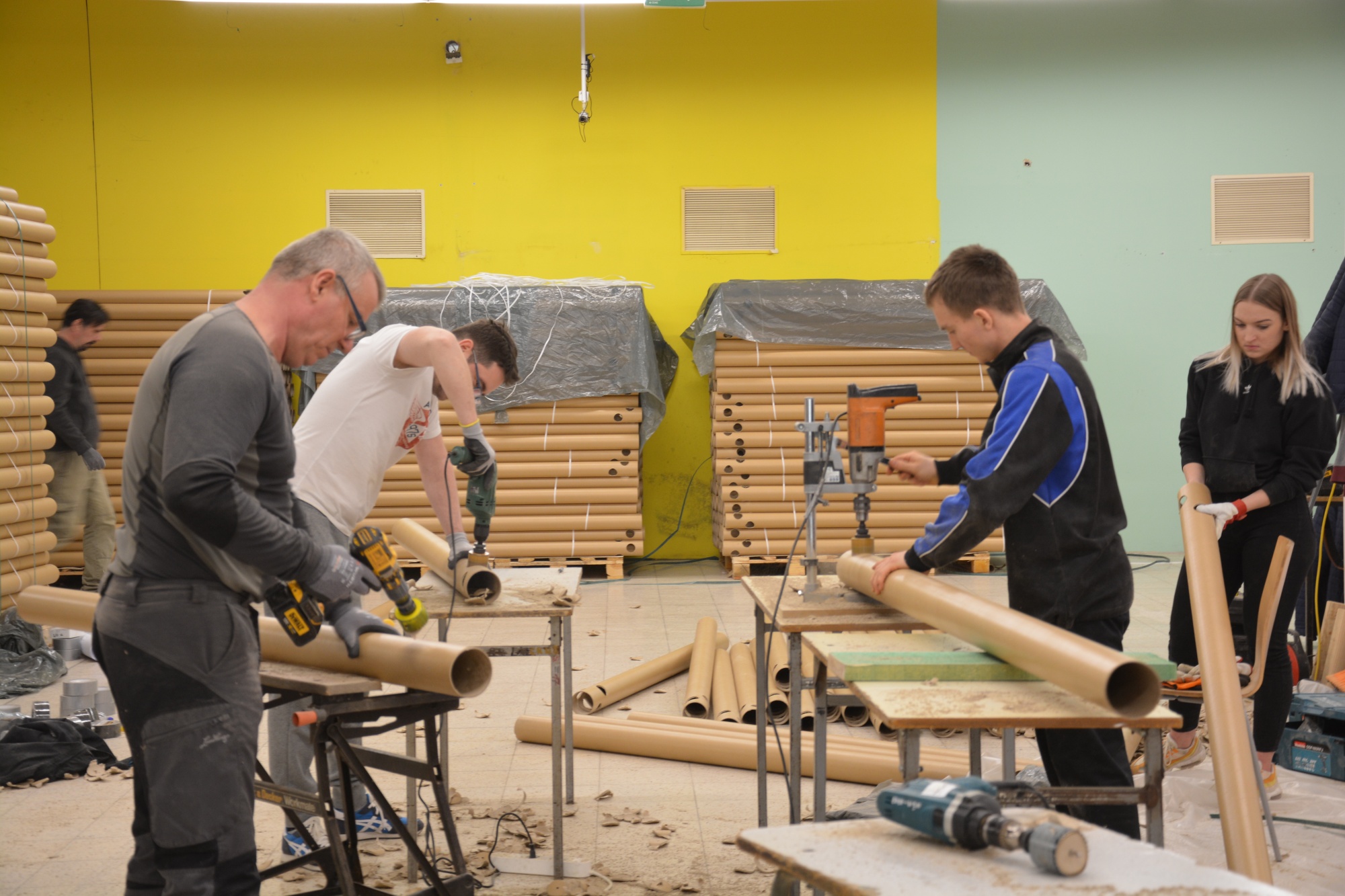 班和Trammer都担任新欧洲包豪斯的大使,是其高级圆桌会议的成员。随着俄罗斯发动入侵,该团体的定期交谈迅速转向救援工作。Trammer招募了切尔姆市长以及专门从事纸质建筑材料的建筑师Jerzy Łątka。(或许并不令人意外的是,Łątka在京都艺术与设计大学师从班那里学习。)Corex Group,一家总部位于比利时的纸板制造商,无偿提供了两卡车的纸管。Łątka邀请过去和现在的学生来领导组装工作,Weronika Abramczyk协调了切尔姆的志愿者,而Agata Jasiołek领导了弗罗茨瓦夫的团队。