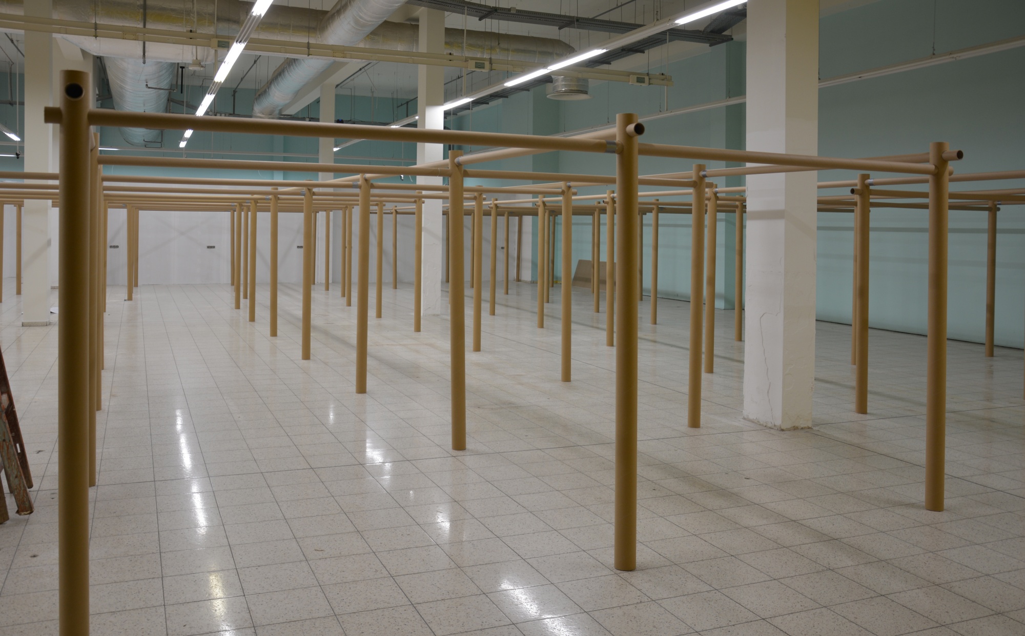 纸隔断系统设计成可以快速使用当地材料搭建。摄影师:Jerzy Łątka部署这种隔断系统在波兰一直很棘手。在一名消防局长提出安全顾虑后,建筑师们现在必须测试和认证纸管的防火性能,以便它们可以在当地法规下获得授权使用,Trammer说。布料隔断还需要符合在公共空间(如博物馆或剧院)悬挂窗帘的相同安全标准。