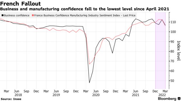 法国商业和制造业信心**在三月份下降到近一年来的最低点,因为对生产前景的乐观情绪急剧下降。这一月度调查是乌克兰战争可能如何影响欧洲产出的早期指标,此前法国政府和央行放弃发布精确的经济预测,因为不确定性加剧。工业领导人对法国统计局Insee确定其业务环境评估的每个要素都变得不太乐观。他们对价格上涨的预期和最近引入的不确定性衡量指标也创下了纪录。