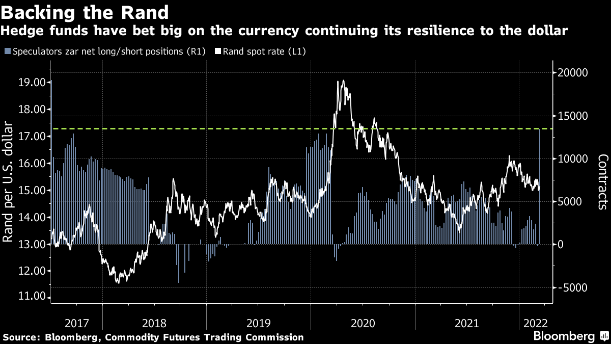 - 货币投机者 正在下注南非兰特,速度创纪录。对冲基金截至3月15日净多头合约达到13,402份,从上周的净空头仓位转为净多头仓位。