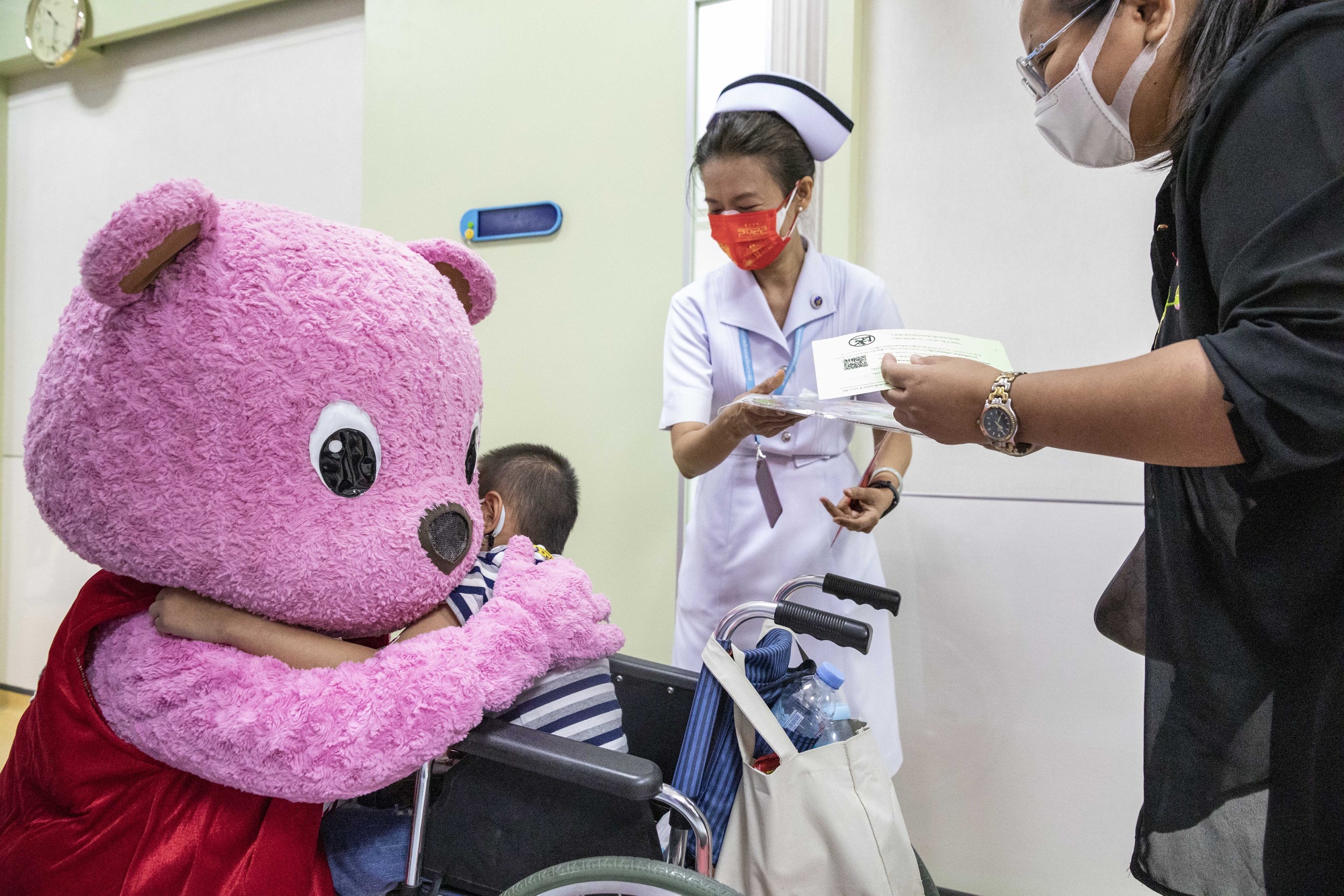 一名医院工作人员在给一名儿童接种辉瑞-联德Covid-19疫苗后拥抱了他。