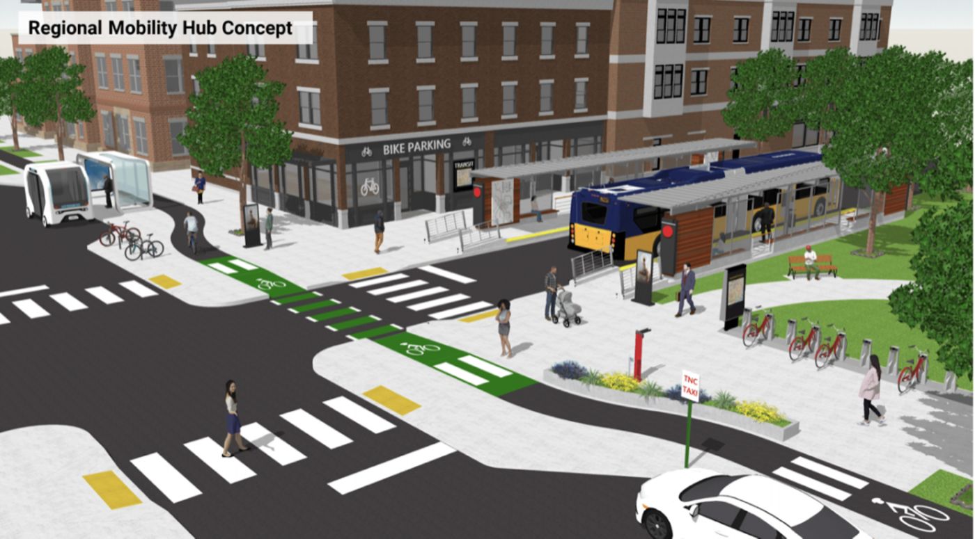 一个多模式交通枢纽的概念插图,在犹他州的The Point,这是一个被称为“15分钟城市”的总体规划社区。