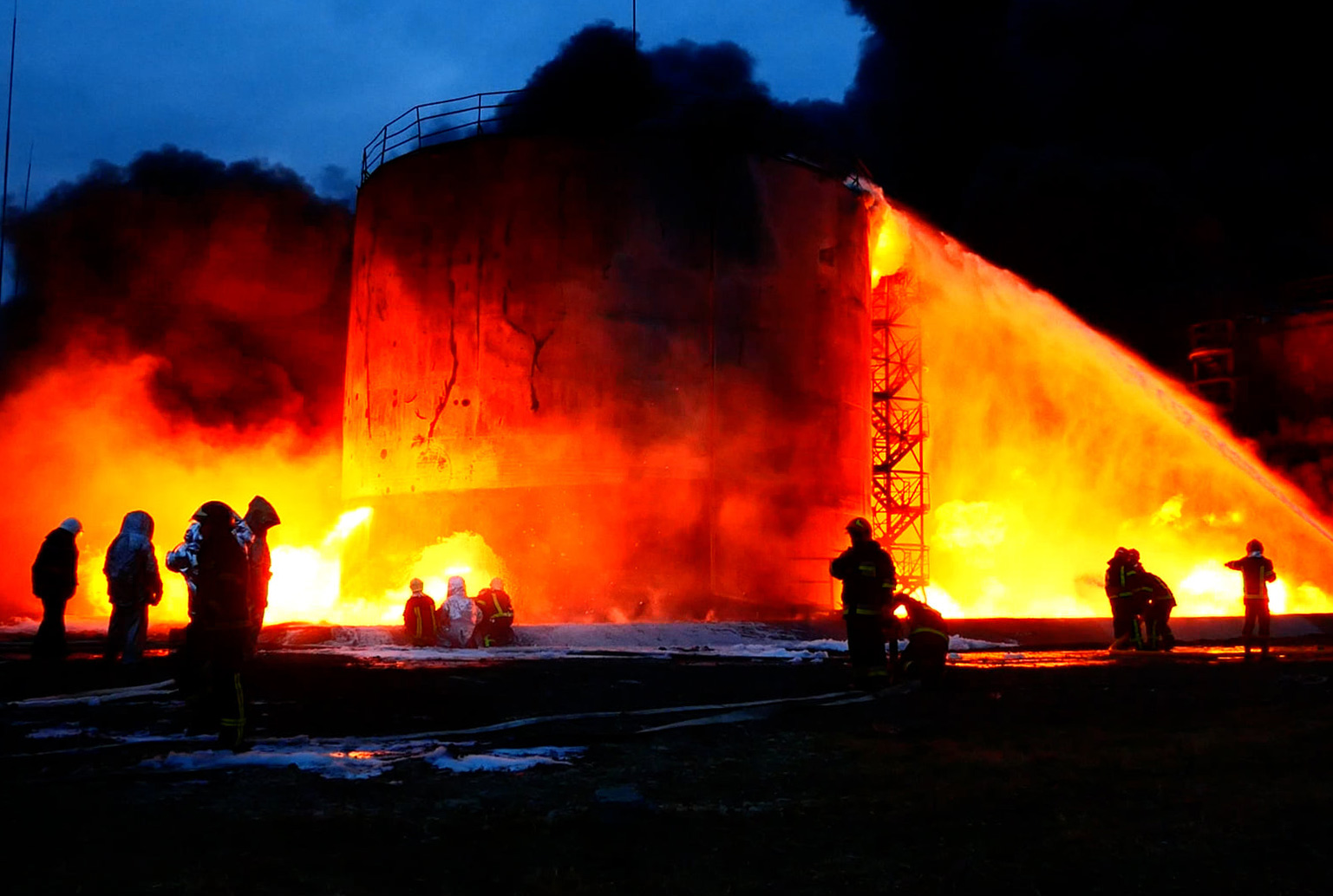 消防员在俄罗斯袭击后,在乌克兰西部利沃夫附近的燃料储存点扑灭大火,日期为3月27日。