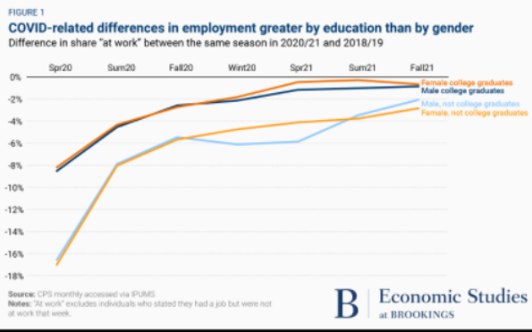 “疫情导致了男性和女性的经济衰退,”戈尔丁在上周在布鲁金斯学会讨论的一份报告中写道。“与以往的经济衰退相比,女性受到的打击更大。但在就业方面,疫情对教育群体的影响差异最大,而不是在教育群体内部的性别之间。”