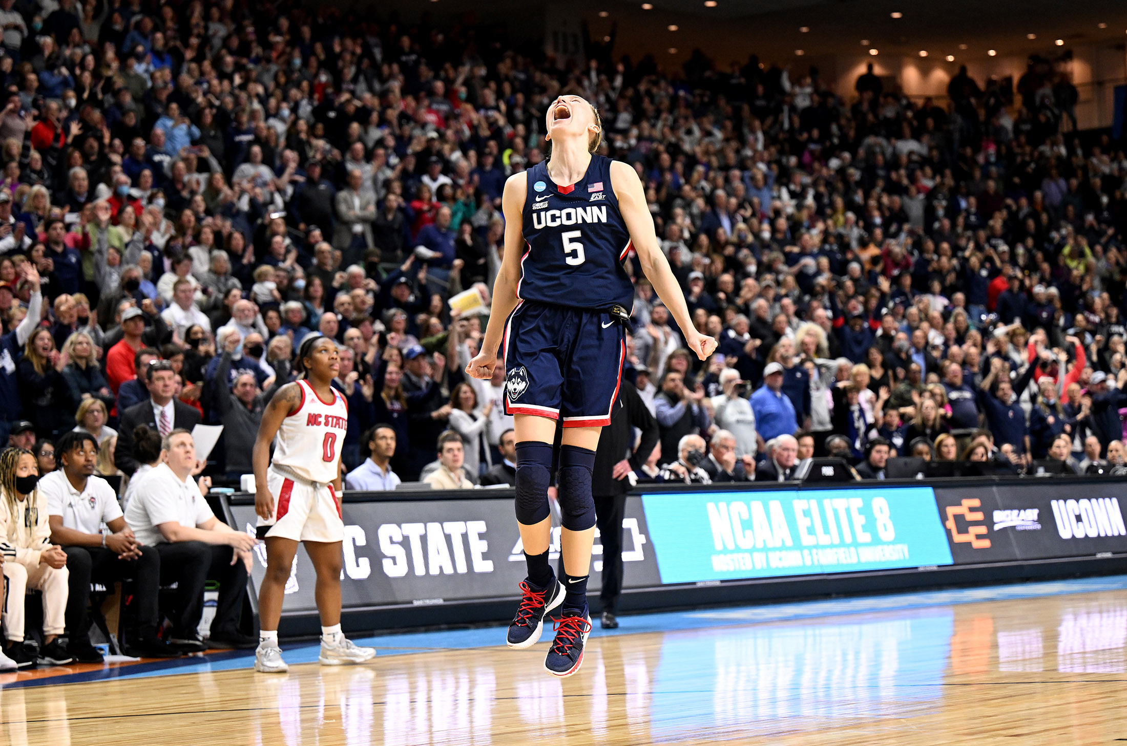 康涅狄格大学雌犬队的佩奇·布克斯(Paige Bueckers)在2022年3月28日的NCAA锦标赛精英八强赛中击败北卡罗来纳州立狼群队后庆祝胜利。