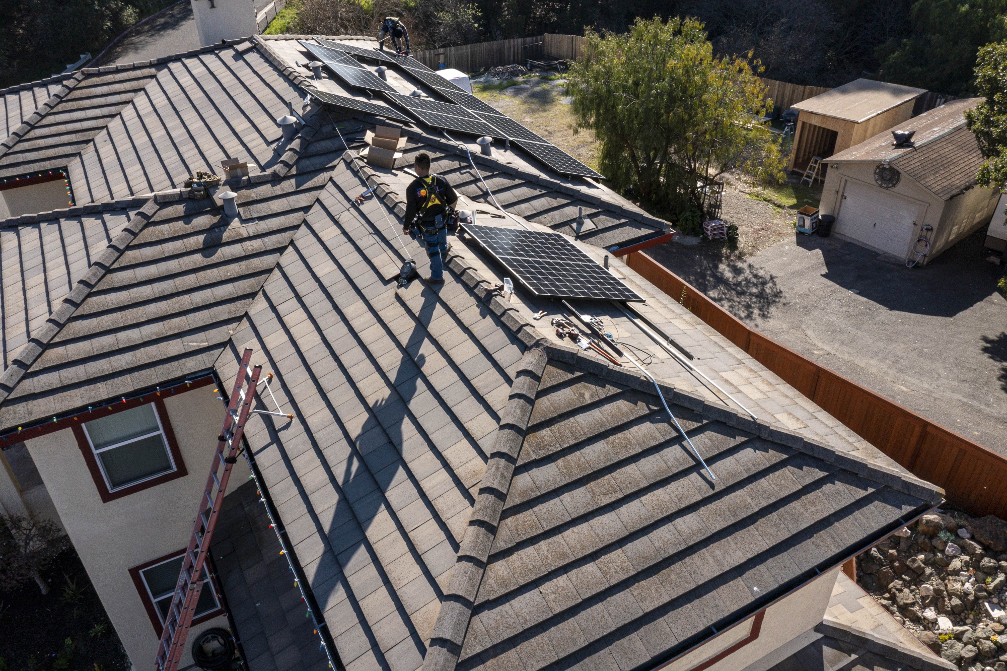 加利福尼亚州海沃德一栋住宅上的太阳能电池板安装。