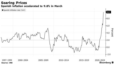 西班牙通胀率飙升至近四十年来的最快速度*,超出预期,因为俄罗斯在乌克兰的战争使本已高企的能源账单进一步攀升。西班牙统计局表示,作为欧盟调和消费价格指数,3月份消费者价格比去年同期上涨了9.8%,超过彭博调查的15位经济学家的所有预测。*