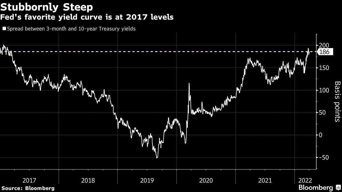 如果你提到了2年期和10年期国债收益率曲线在上周倒挂 -- 意味着短期收益率上升到长期收益率之上 -- 有人可能会迅速提醒你,实际上,美联储最喜欢的收益率曲线仍然非常陡峭。