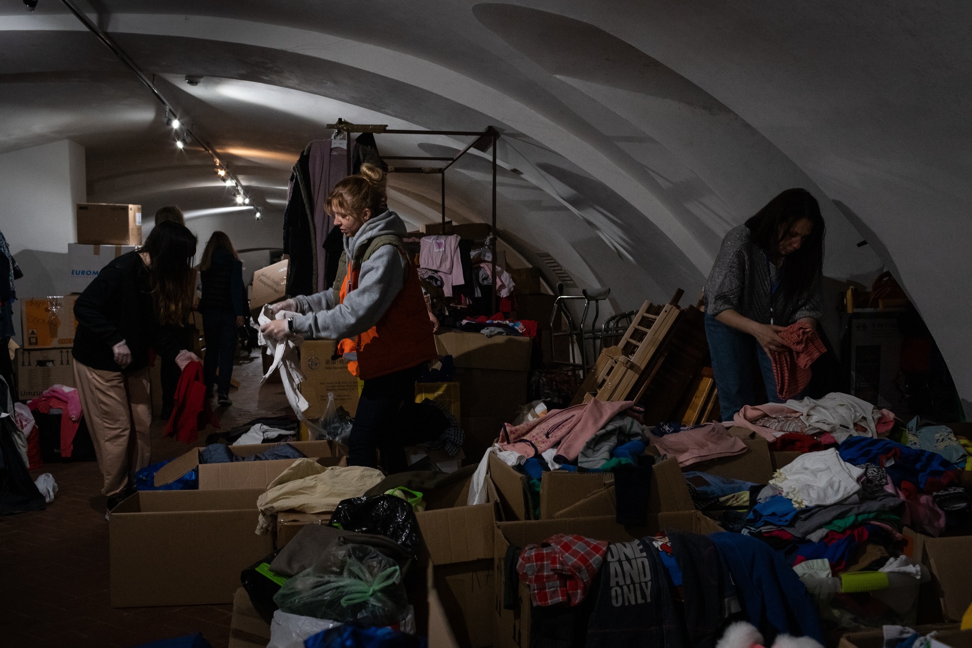 志愿者在乌日霍罗德的一个人道主义援助中心整理衣物,时间为3月31日。除了已经离开该国的400多万难民外,乌克兰国内流离失所的人数已经超过1000万。