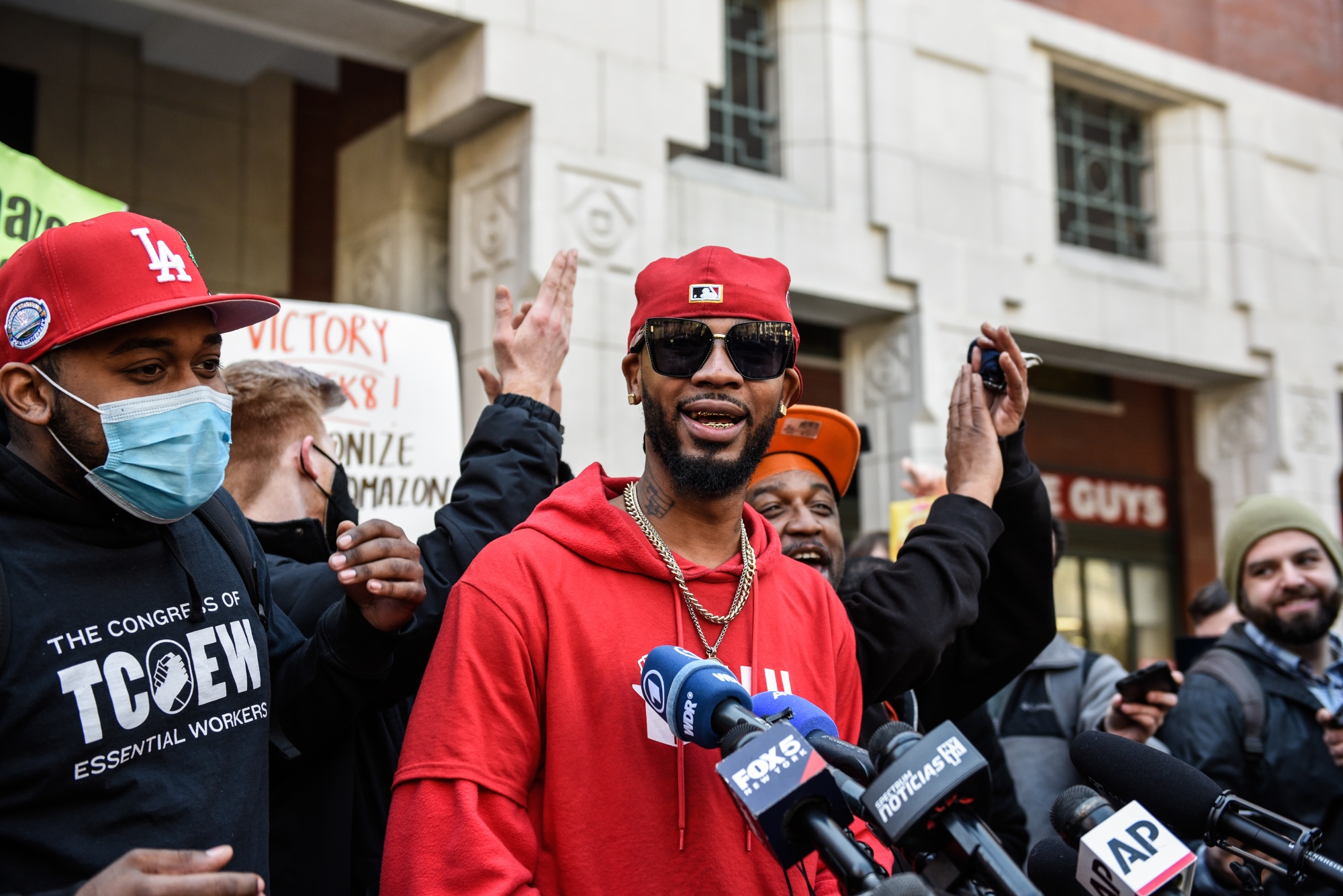 克里斯蒂安·斯莫尔斯(Christian Smalls),亚马逊劳工工会(ALU)创始人,在纽约布鲁克林的国家劳工关系委员会办公室外举行新闻发布会,时间是4月1日。