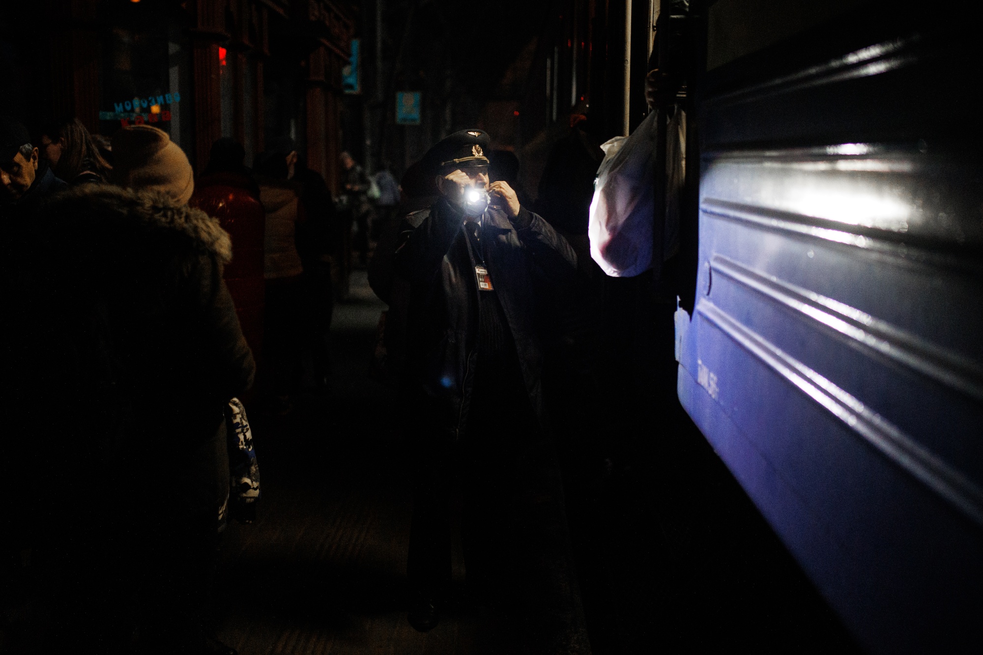 3月2日在利沃夫火车站的列车售票员。夜间列车不开灯是因为空袭的风险。摄影师:欧罗巴通讯社新闻/欧罗巴通讯社