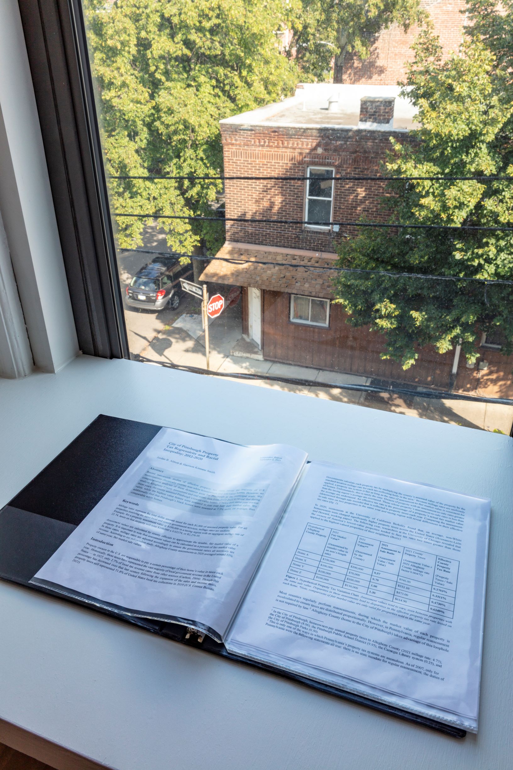 由史密斯和乔丹·阿博特制作的“匹兹堡市财产税回归性和种族不平等:2012-2020”研究的副本,作为“Sed Valorem”展览的一部分。来源:床垫工厂基于文件的Sed Valorem组成部分是一种名为“制度批判”的小众艺术传统,这是一种概念艺术形式,艺术家在其中融入邀请观众审视意识形态和权力体系的策略和实践。史密斯借鉴了像卡梅伦·罗兰这样的艺术家的作品,后者也将文档纳入其作品中。
