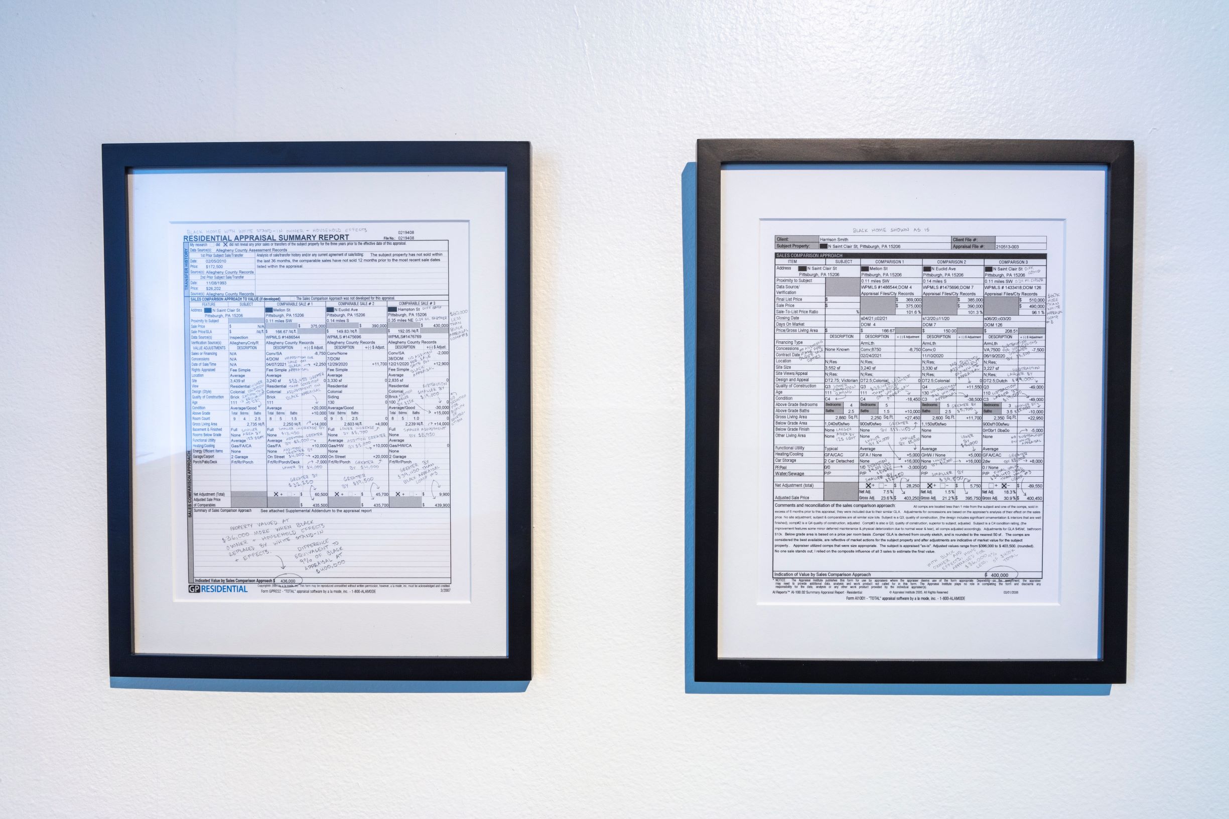 史密斯的《房主评估(价值比较方法)》展示了官方文件,显示了一栋房屋在有或没有标志表明有黑人居住的情况下评估的差异。来源:床垫工厂“我对种族意识形态和经济权力体系的这些抽象概念感兴趣,我们认识到它们存在于世界中,但往往难以把握,”史密斯说。“我在艺术中感兴趣的是找到这些抽象概念与实际物质现实之间的交汇点。我看到财产税收的不公平是这些抽象概念被转化为黑人的物质差异的完美场所。”