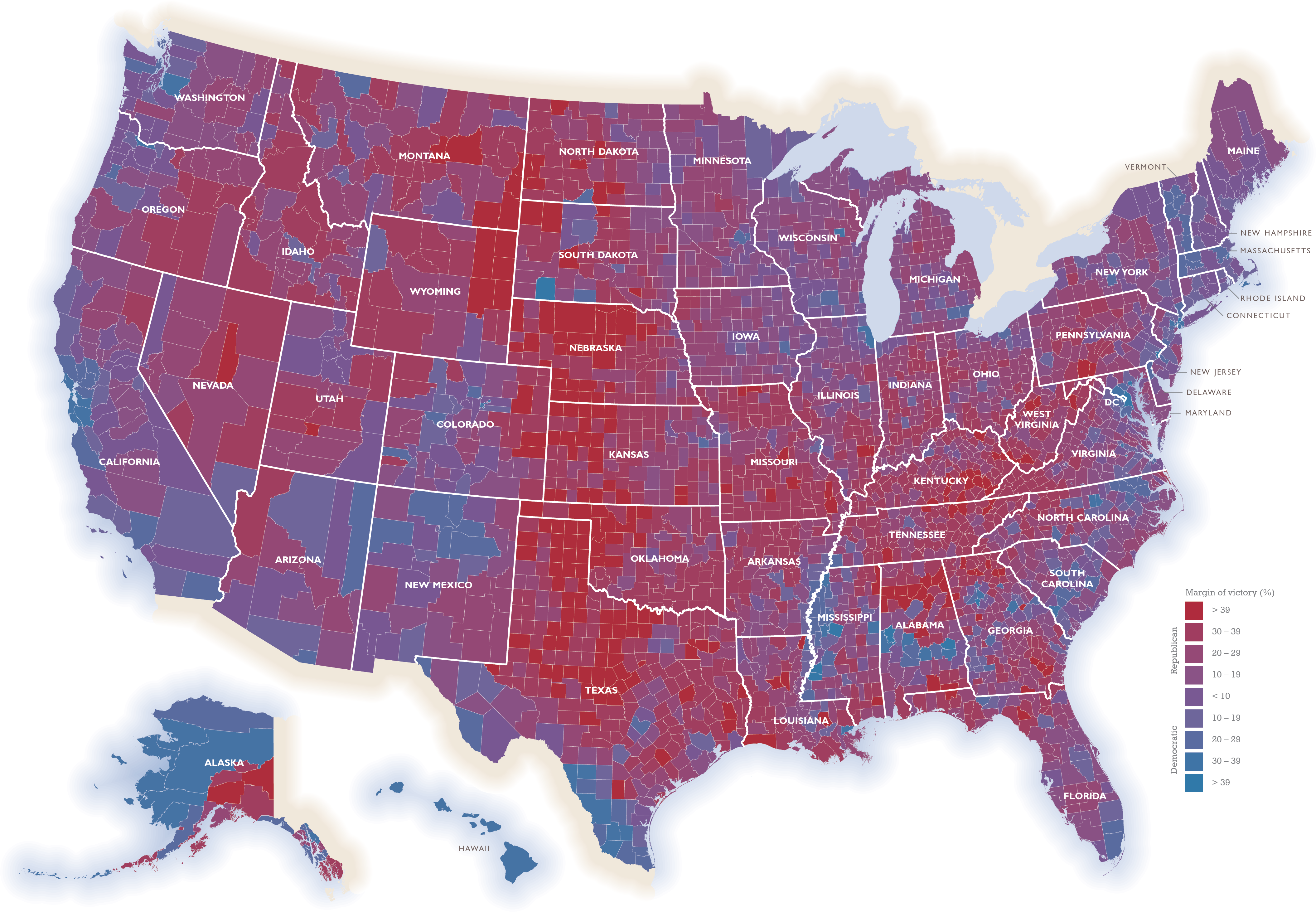 混合色调分级图:每个县根据获胜党的胜利幅度着色。胜利幅度越小,县的颜色就越紫。这幅地图呈现了美国政治现实的不同画面,因为大多数县都呈现出紫色调,而不是鲜明的红色或蓝色。由Esri的Kenneth Field提供,来自“主题制图”为什么具体是101张地图?最重要的是,这本书里真的有101张地图吗?