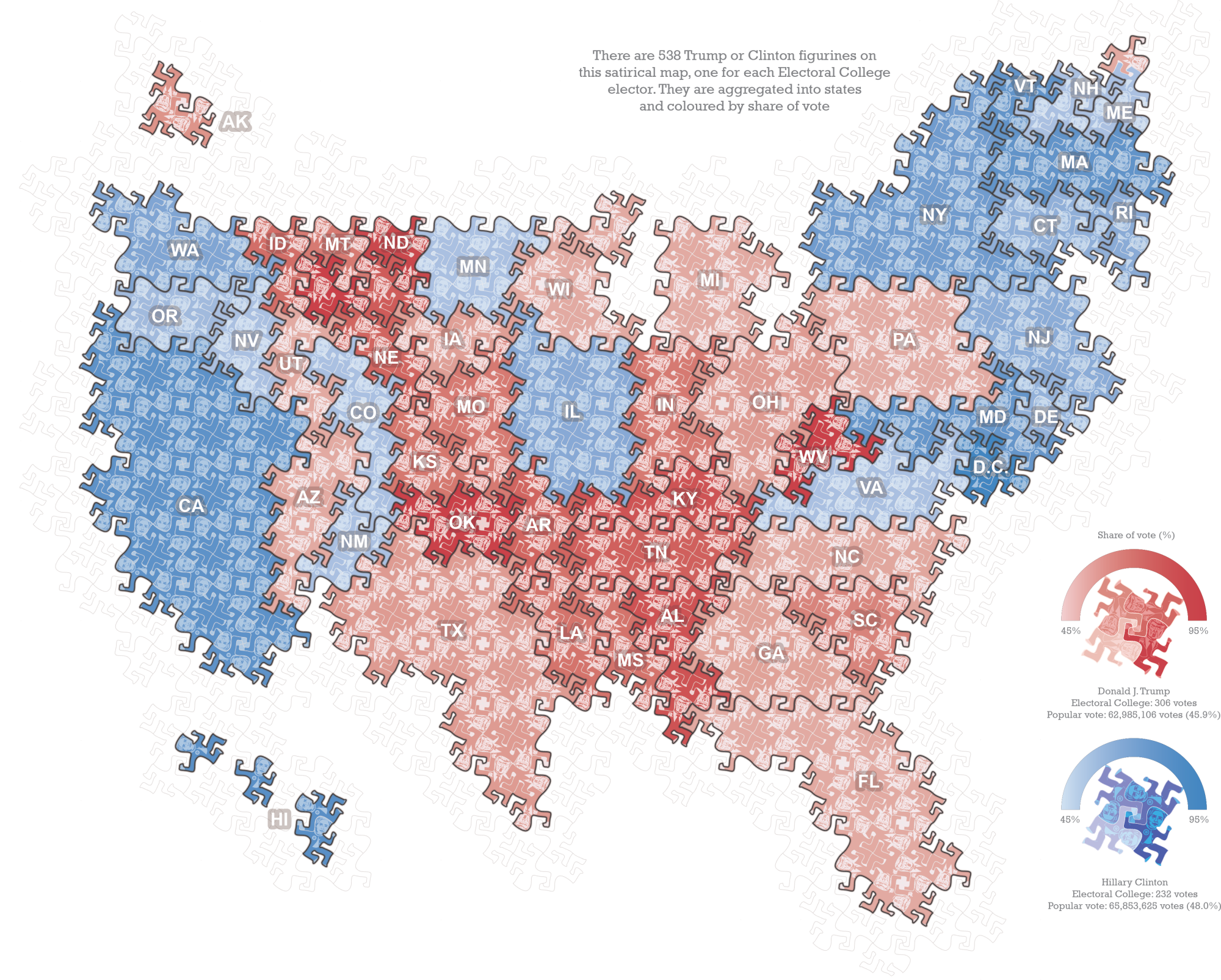 受艾舍尔启发的2016年选举结果卡托克图。选区被表示为人形瓷砖,取决于是希拉里·克林顿还是唐纳德·特朗普赢得了该选区。