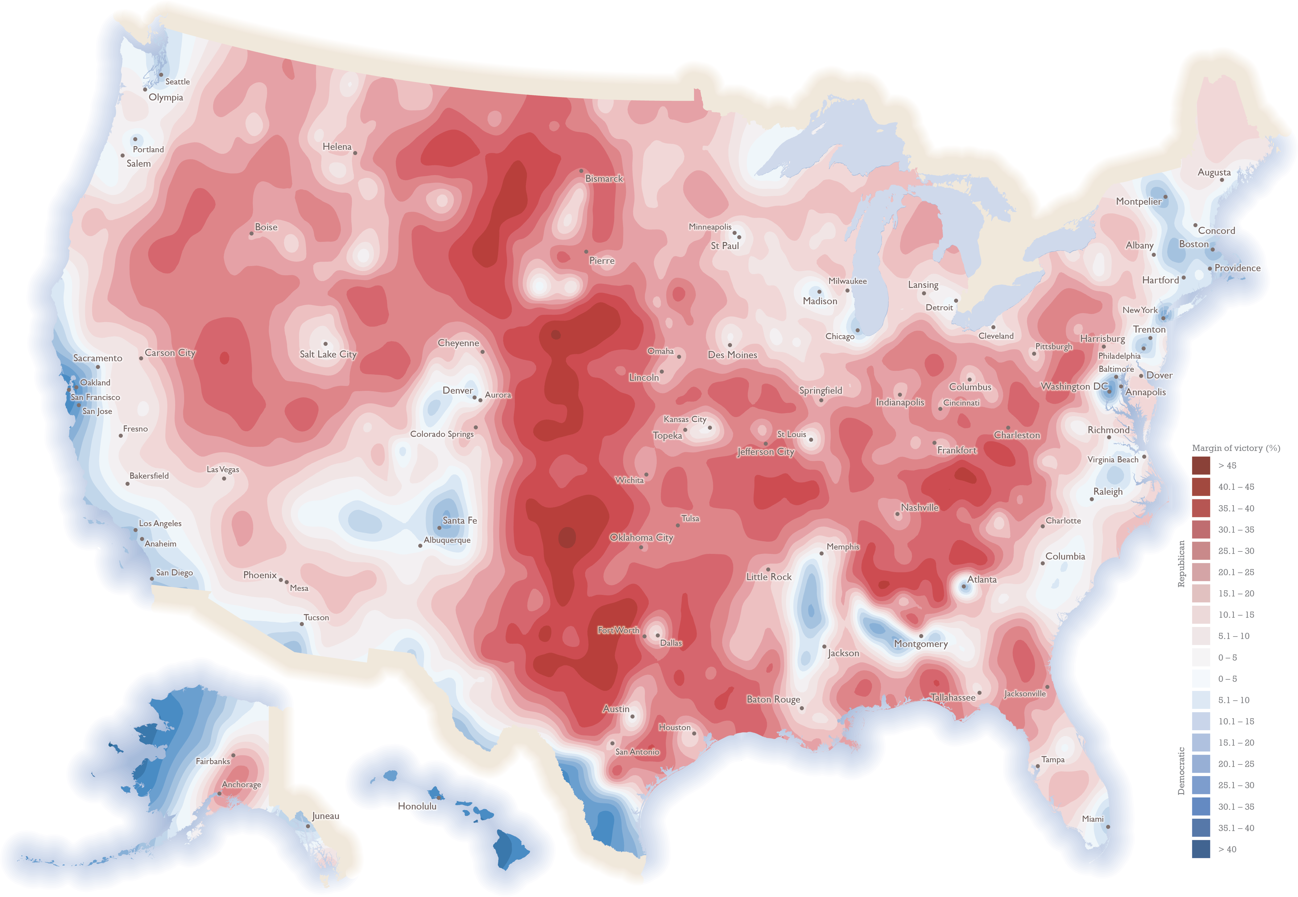 填充轮廓地图(或等值线图)。每个轮廓根据该地区的胜利幅度着色。由Esri的Kenneth Field提供,来源于“主题地图”我认为消费者方面变得更加了解如何阅读地图也非常重要。最重要的是要理解地图技术是如何传达信息的:它是如何说服你接受某种观点的。