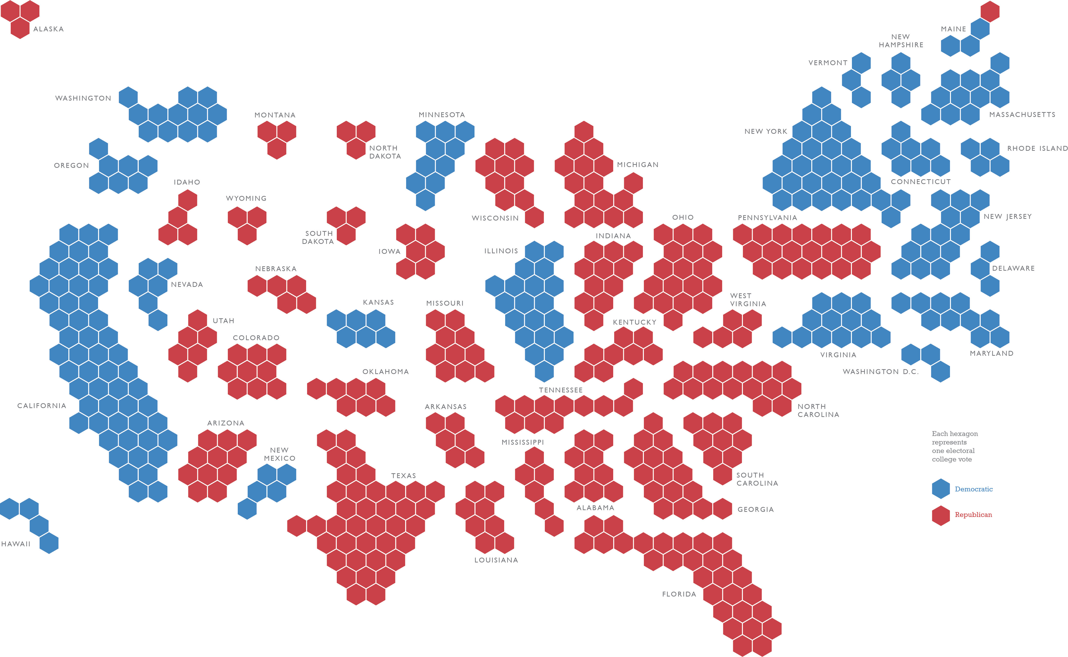 选举结果的非连续卡托克图。每个六边形代表一个选举人票。在大致保留地理位置的同时,展示了各州之间的人口差异。由 Kenneth Field, Esri 提供,来自“主题地图”为什么你选择专门使用2016年选举数据集进行工作?