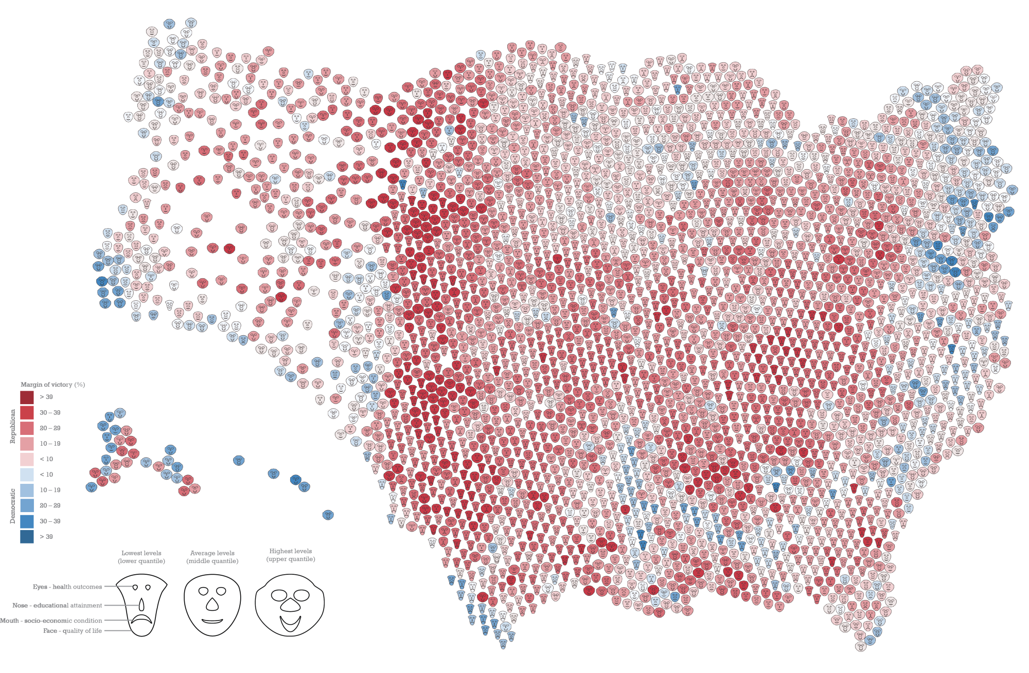 美国的切尔诺夫面孔:每个县都用卡通风格的面孔代表。面孔的特征编码了该县的社会经济变量。面孔的颜色代表了获胜候选人的胜利幅度。由Kenneth Field, Esri提供,来源于“专题制图”