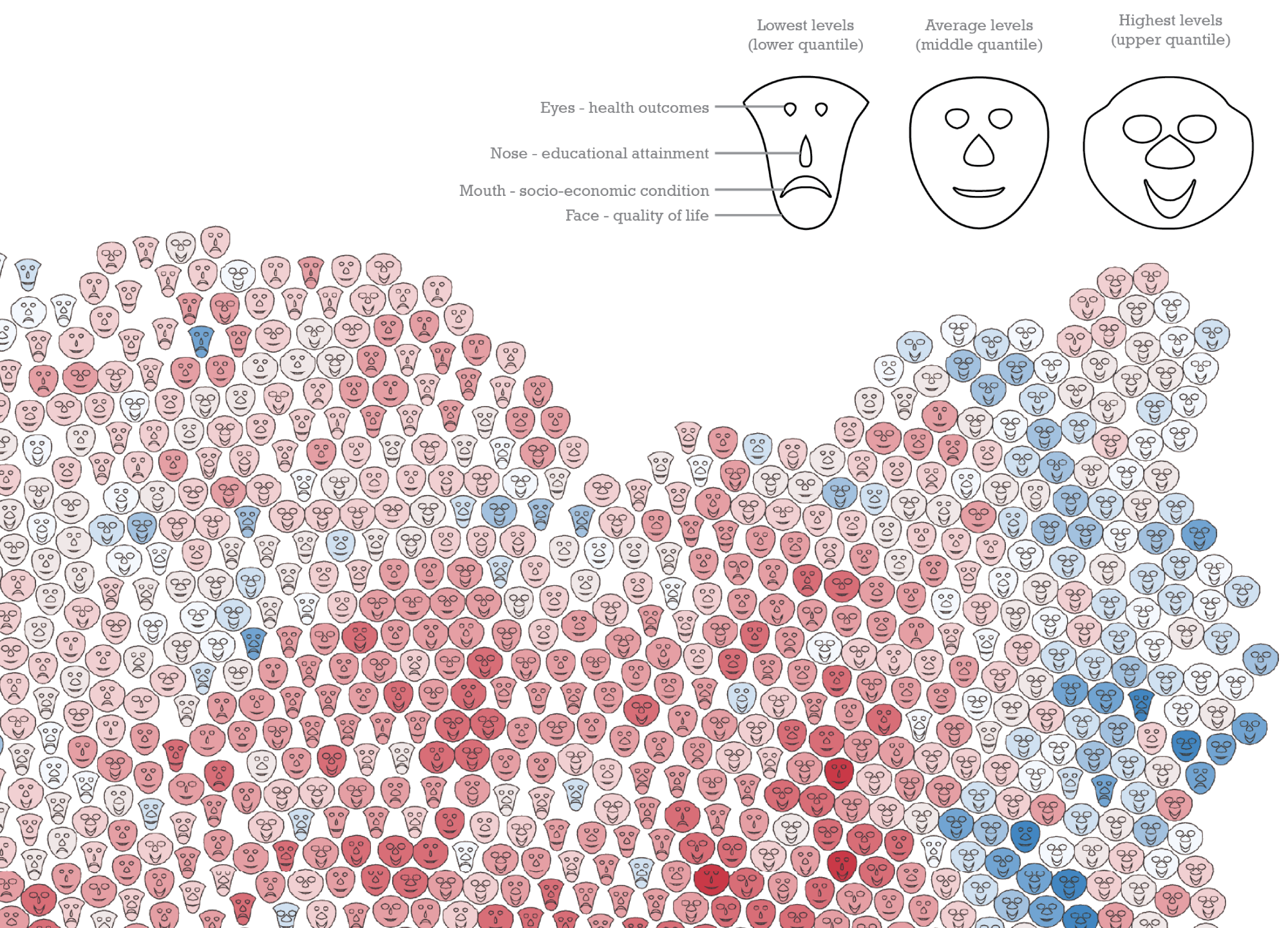 从技术上讲,肯定有一些地图有点具有挑战性,这就是为什么我们很少看到它们。特别有一个:切尔诺夫面孔等距图[切尔诺夫面孔方法是一种数据可视化技术,通过将变量编码为卡通般的面部特征来表示]。当您翻开页面看到那张地图时,您会觉得,“哦,那很奇怪。”那是因为我们几乎从不见到它们。这是有原因的:它们在技术上具有挑战性,而且也很难阅读。