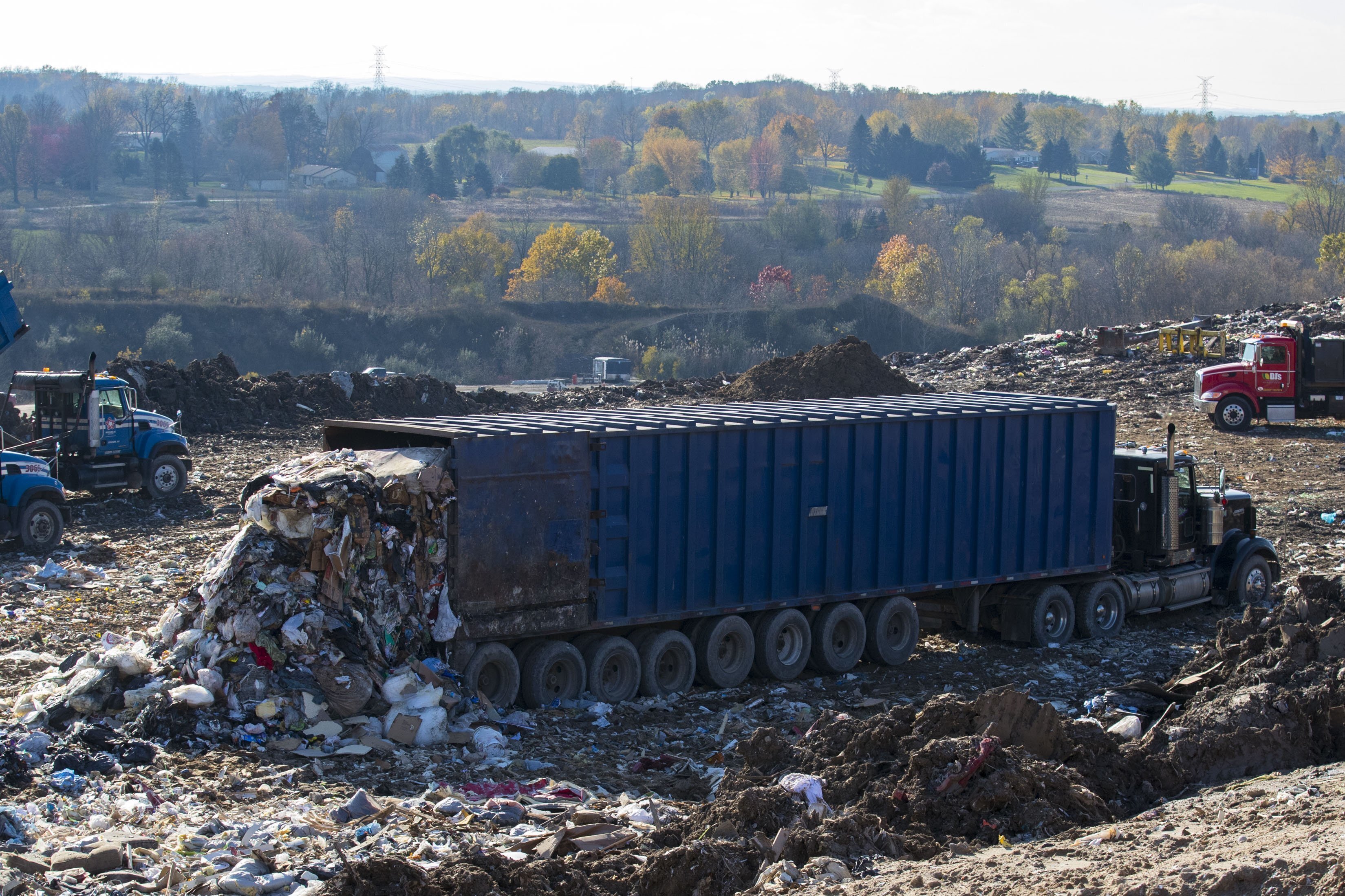 一辆卡车在密歇根州拜伦镇的南肯特垃圾填埋场卸下一车垃圾,时间是2017年11月8日。2022年4月7日星期四,美国国家海洋和大气管理局发布了一项研究,计算出2021年强效温室气体甲烷的水平以创纪录的速度上升。甲烷来自能源使用、农业和垃圾填埋场,也是一种天然气体。(迈克·克拉克/大急流城新闻社,通过美联社,文件)