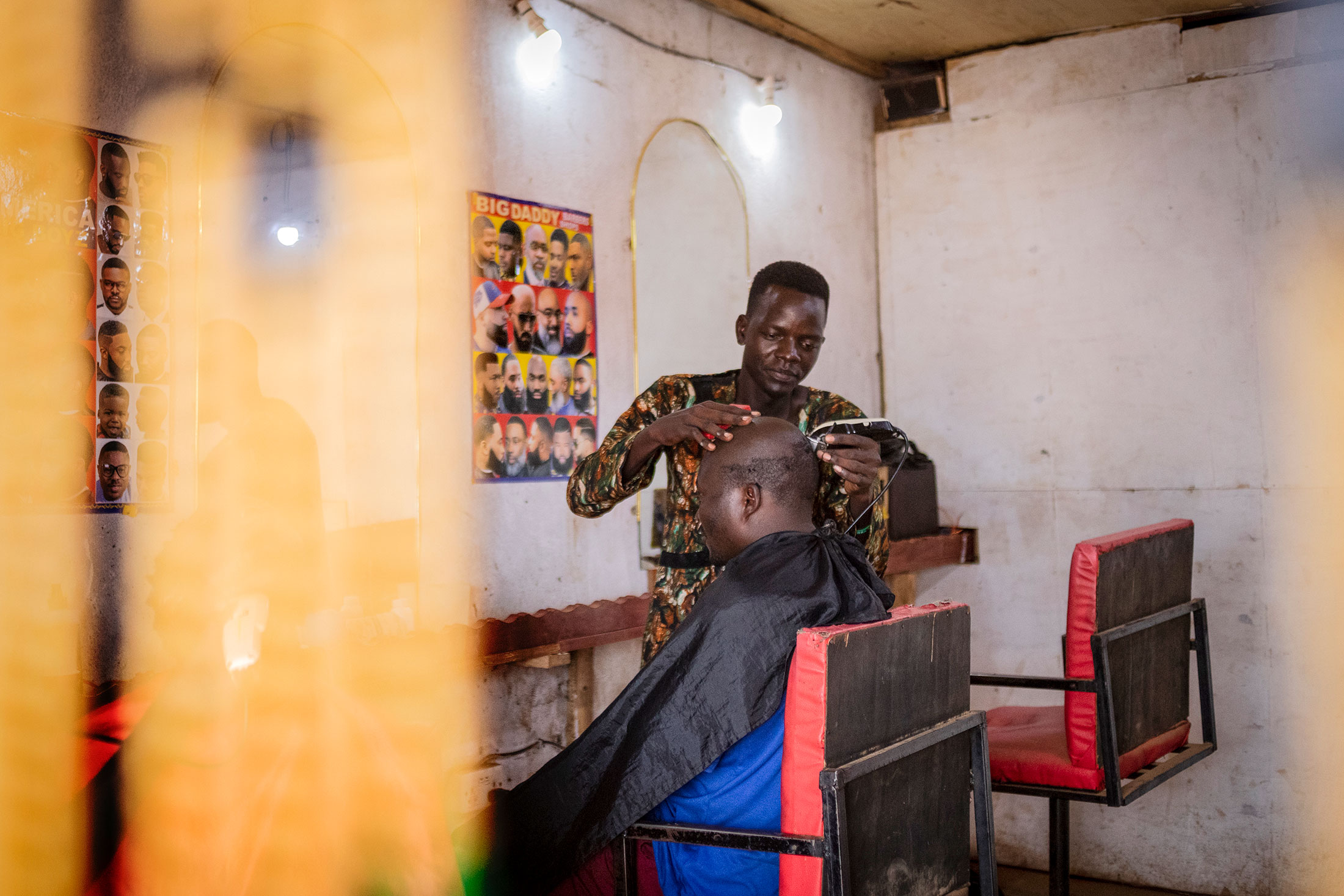 一位理发师在基兰东戈使用太阳能电池板为他的生意提供动力。摄影师:Katumba Badru Sultan/Bloomberg Green### 向难民销售