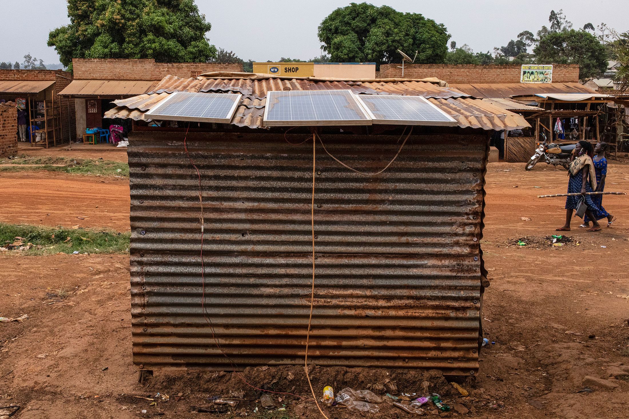 太阳能电池板为理发店提供动力。摄影师:Katumba Badru Sultan/Bloomberg Green2019年,美国国际开发署资助了三家付费公司,向难民营居民销售太阳能家庭系统。尽管非洲和其他地方的一些难民营已经依赖合作社运营的集中太阳能电网,但Kiryandongo的试点项目是为了让付费公司参与个人住宅的电气化工作。