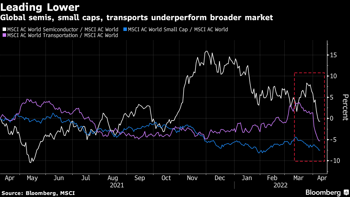 全球股市的涨势正在停滞,而在其引擎下面,情况正在恶化。股市的三个关键领先指标 — 半导体、小盘股和运输股 — 相对基准同时出现下滑,这对股市看涨者来说并不是一个令人鼓舞的迹象。全球半导体股的指数已跌至近六个月的相对低点,而小盘股和运输股的等价物与更广泛市场相比已接近自2020年底以来的最低水平。这三个群体都对基础经济敏感,这使它们成为股市核心实力的有用指标。