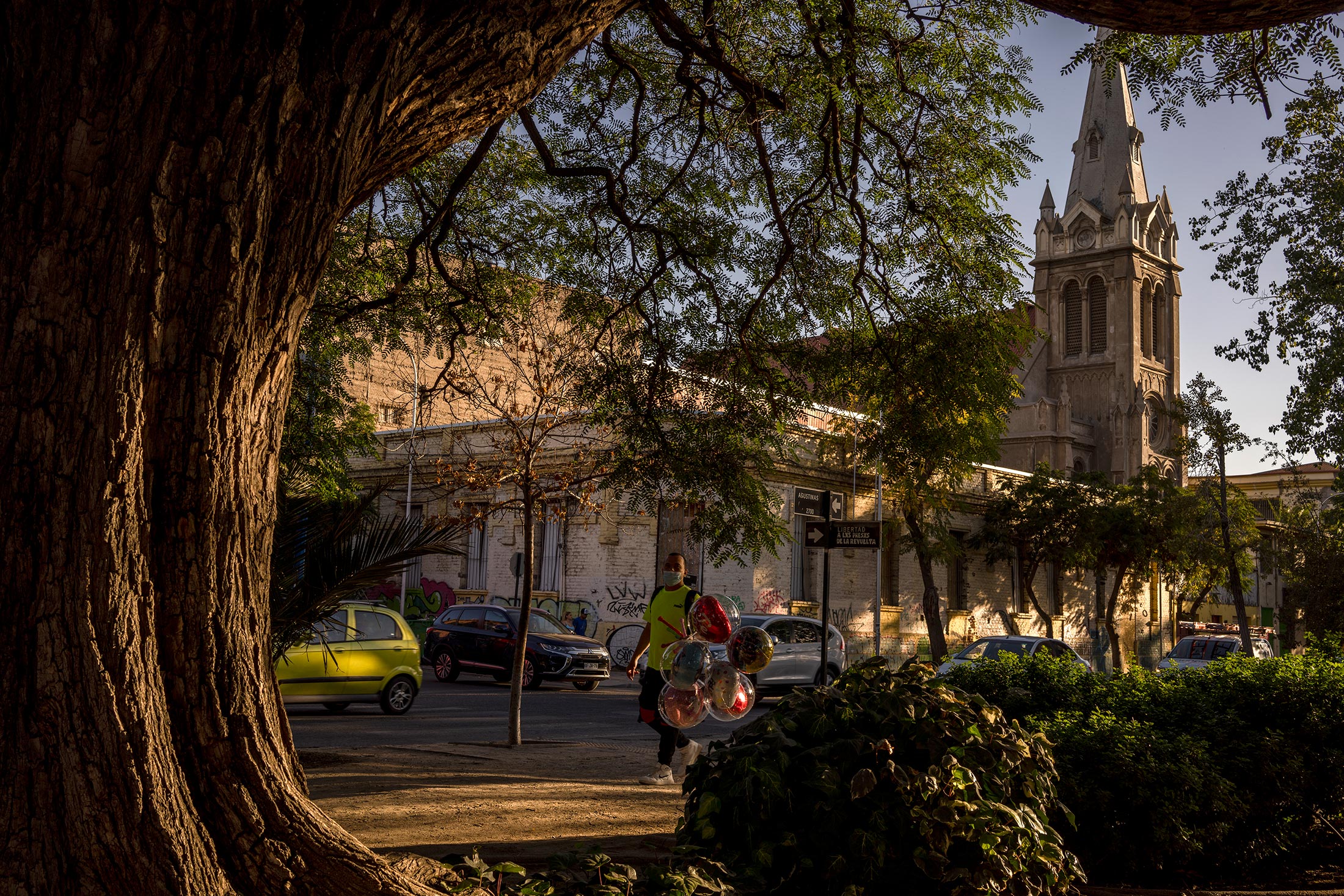 一个小贩在智利总统加布里埃尔·博里克最近搬入的Yungay社区的Portales公园卖气球。