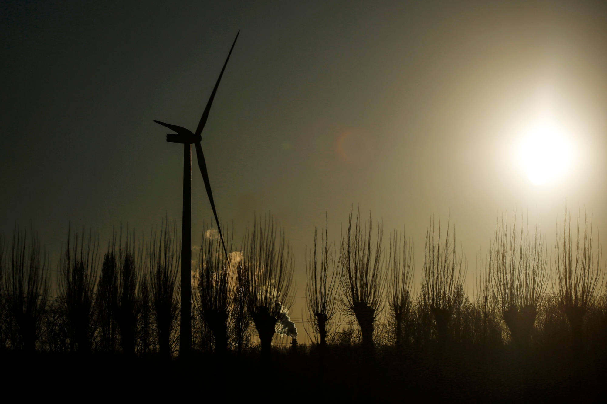 比利时根特的一家钢铁厂的风力涡轮机和烟囱。