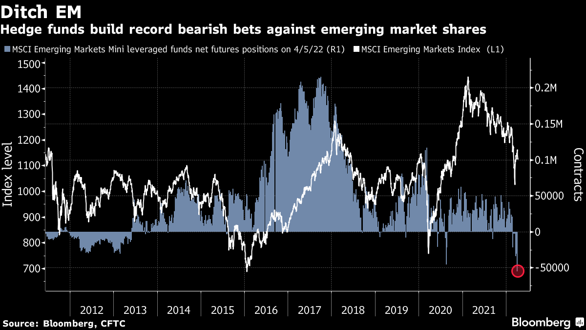 至少根据期货市场的数据,对新兴市场股票的空头杠杆基金头寸从2011年以来达到了创纪录水平。根据商品期货交易委员会最新数据,与MSCI新兴市场指数相关的期货的净空头杠杆基金头寸已经达到了创纪录水平。今年截至上周五,这一发展中市场股票的指数下跌了近9%,表现不及发达市场同行近2个百分点。俄罗斯入侵乌克兰、全球通胀上升以及中国监管收紧等风险都对此产生了影响。