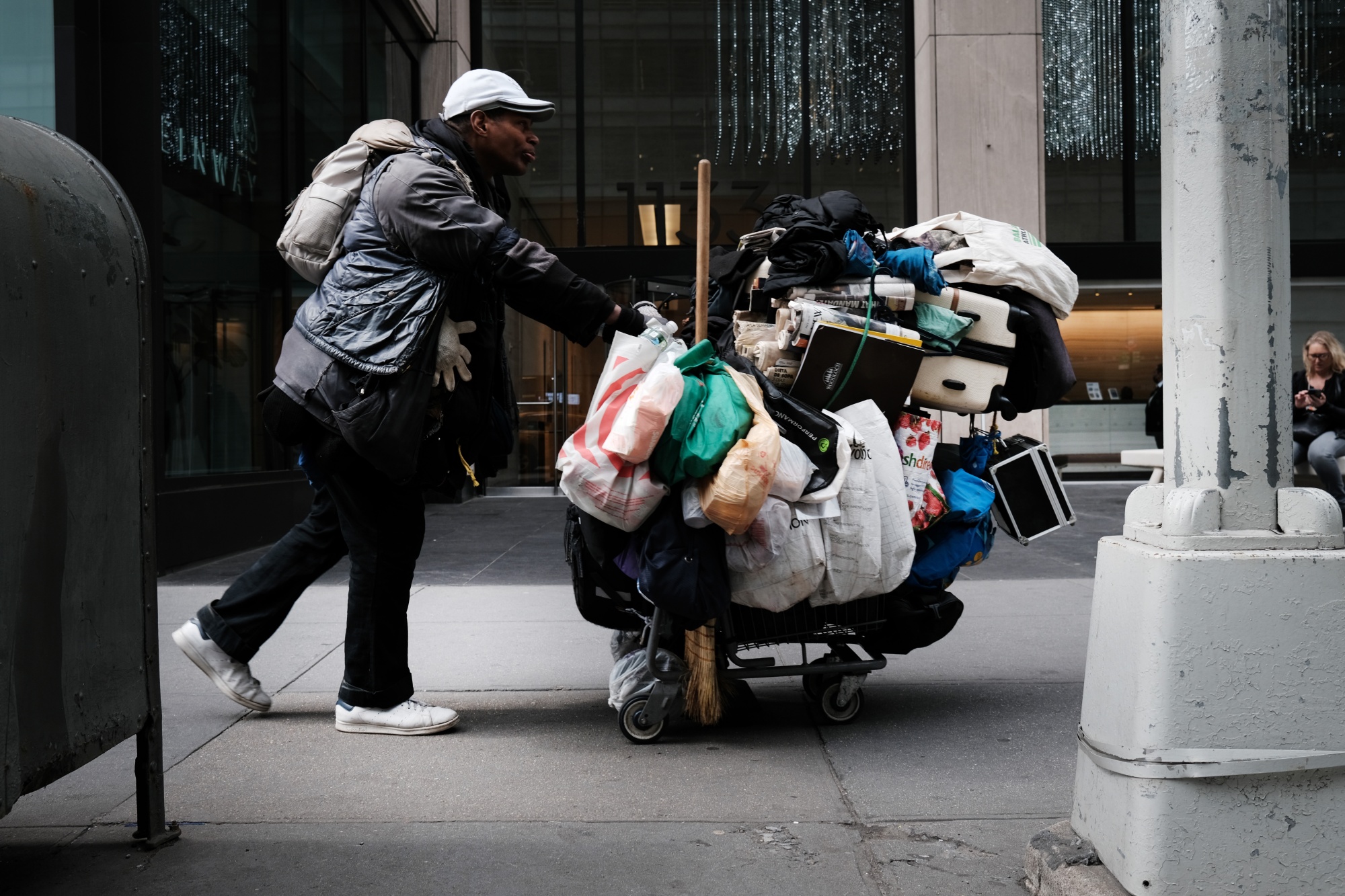 一个无家可归的男子在3月31日穿过曼哈顿。