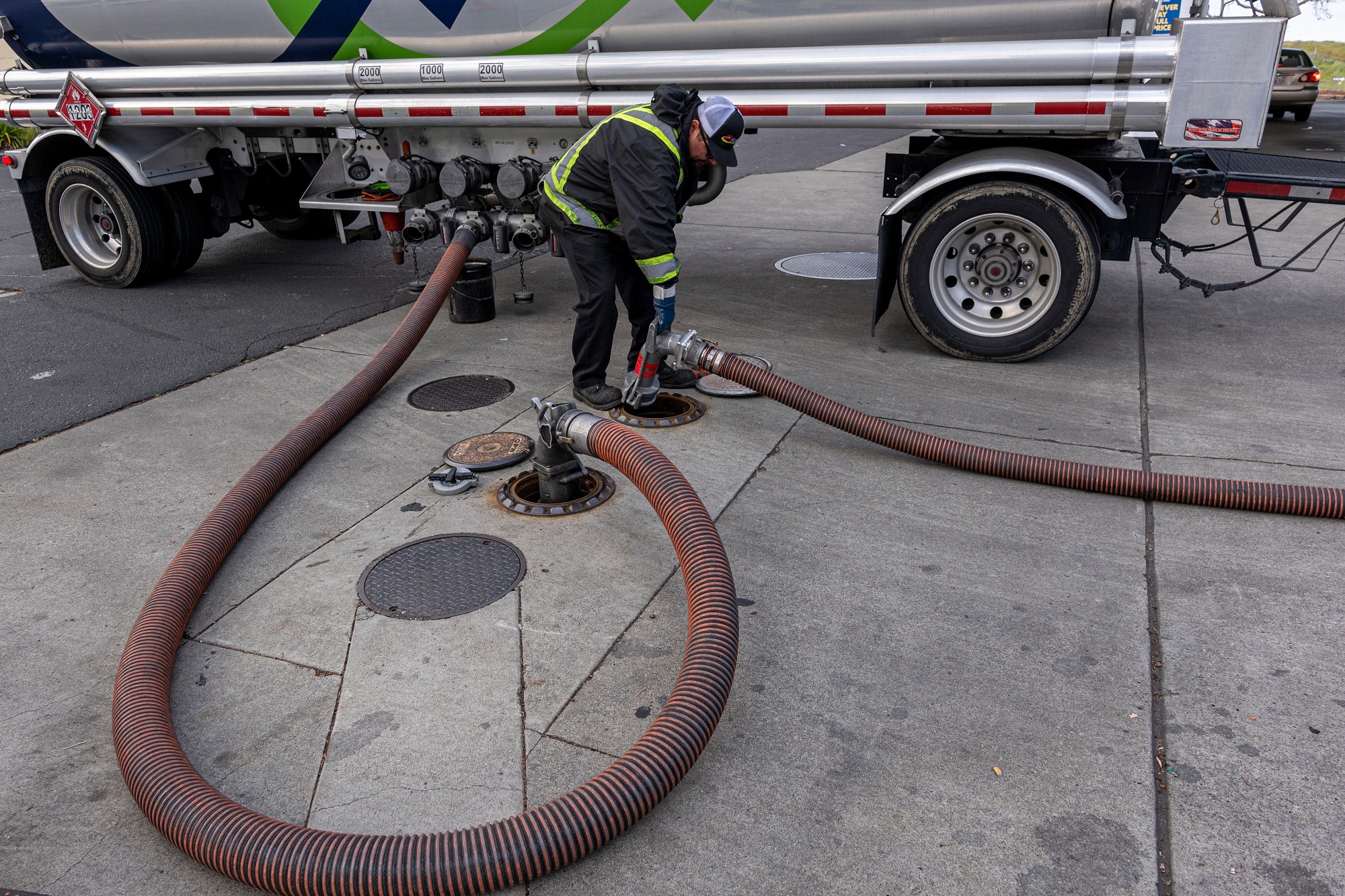 一个分销商在美国加利福尼亚州赫尔库勒斯的一个加油站送油。