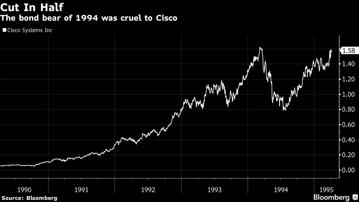 如果你看看那个时代的市场宠儿之一思科系统,它在1994年的浩劫结束前跌去了一半。在那个十年后期,它反弹并一路走强,随着互联网泡沫的形成而飙升。