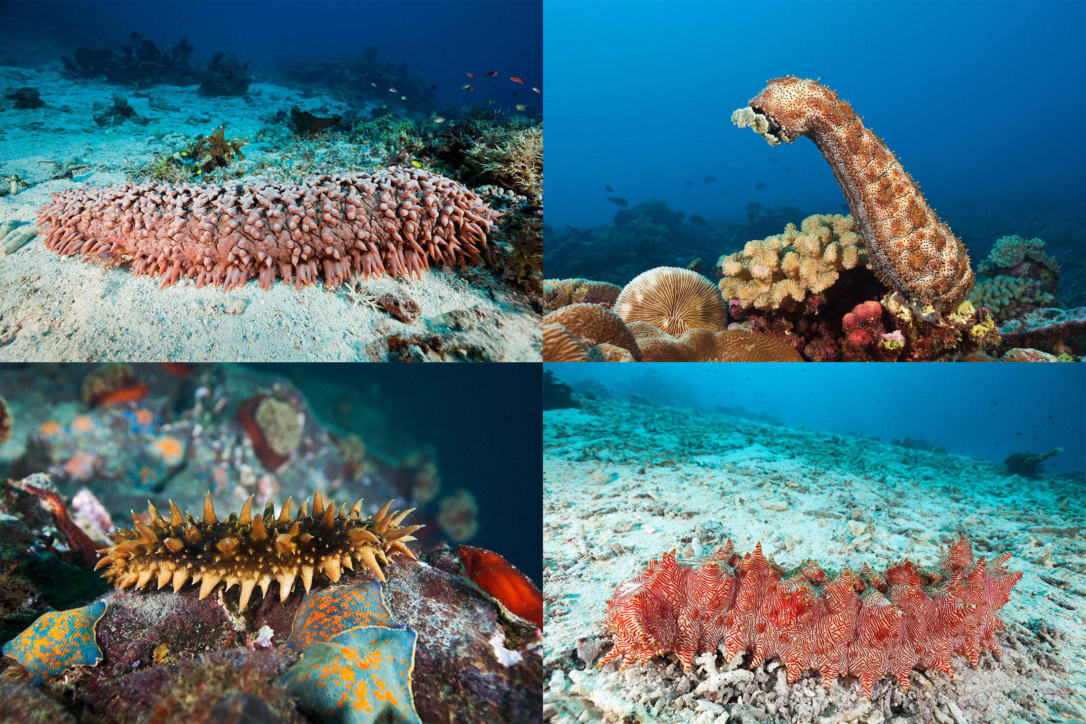 仅在过去的15年内才清楚海参对海洋有多么重要。来源,从左至右:ifish/Getty Images; Reinhard Dirscherl/Science Photo Library; ifish/Getty Images; Alexander Semenov/Science Photo Library“它们很容易用手收集。它们不会逃跑。它们就在那里。如果你能潜到它们生长的深度,你只需要捡起它们,” Purcell说。