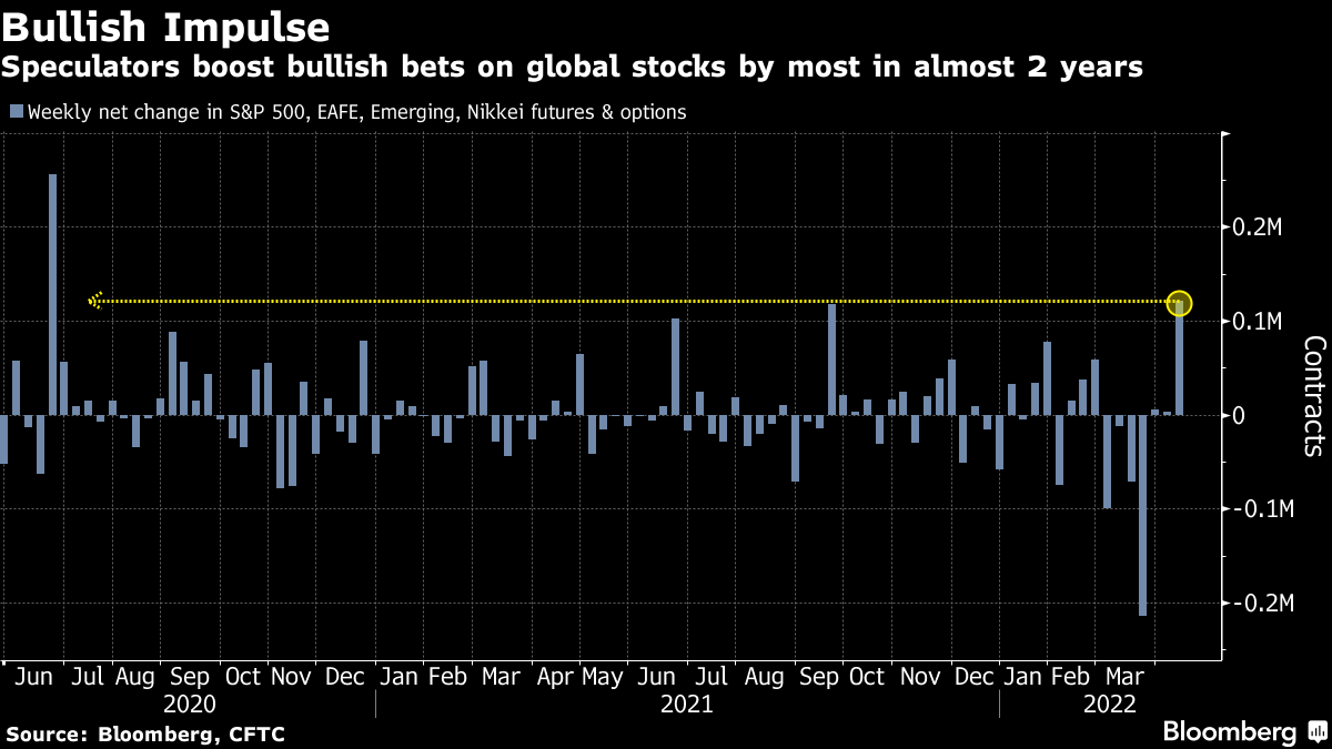 尽管全球股市仍然承受压力,但看起来看跌的投资者情绪似乎在缓解,至少根据期货市场的信号。上周,美国、欧洲、新兴市场和日本股指期货和期权的总体投机性押注指标,根据商品期货交易委员会的最新数据,跃升至近两年来的最高水平。全球股市指数MSCI本月迄今已下跌超过3%,人们担心通胀激增以及俄罗斯入侵乌克兰的持续影响可能对经济增长造成潜在影响。但买入低点的冲动仍然强烈。