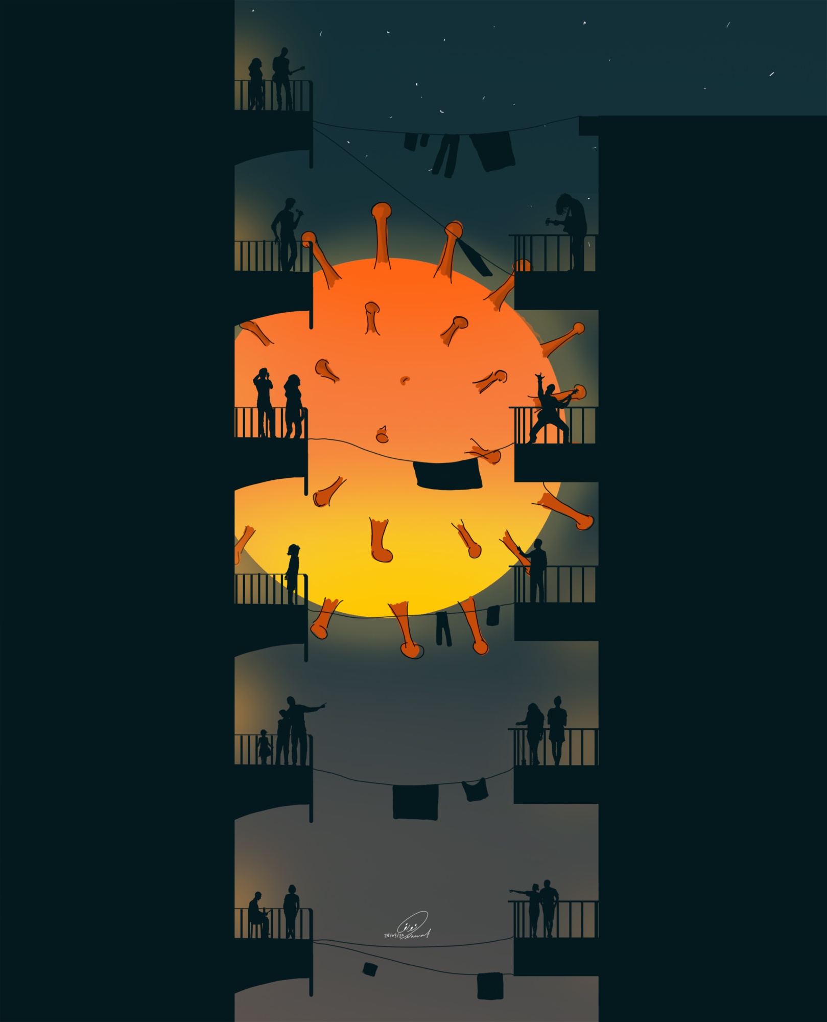 尽管如此,值得尝试重新领会这种说法的基本真相。虽然感觉不到,但我们成为了一场终身难忘的奇观的见证者。一场无情地跨越地球的大流行,世界各大城市在一夜之间陷入寂静,科学家们争分夺秒地对抗一种病毒入侵者 —— 这是X世代孩童时代看过的灾难电影的素材。但在现实生活中,这往往不是一部全球性大片,而是一系列在家中、医院走廊、公寓和后院中上演的客厅戏剧,每一个都与其他人隔绝,不可见也不可知。