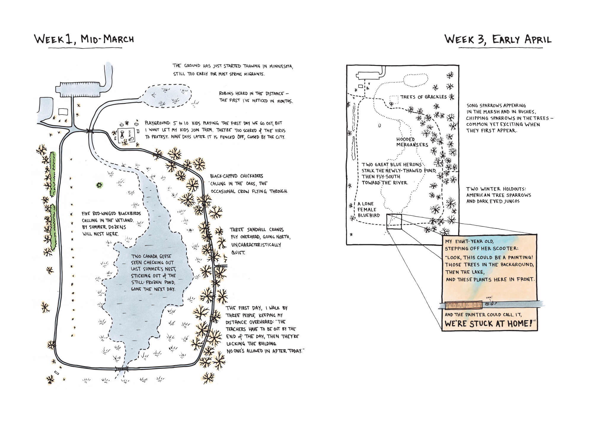 明尼苏达州的Rick Bohannon绘制的一幅街区观鸟图。Rick Bohannon,隔离地图集早期大流行的一个梗是,像我这样的X世代,由于我们童年时对后启示录流行文化的深度接触以及对电视浸润式自我隔离的能力,“为这种破事而生”,正如《纽约》的Will Leitch在2020年3月所写。我们相信,观看《末日余生》和《安德洛梅达病毒》等影片使我们这一辈具备了应对隔离、野外医院以及大流行可能带来的其他任何恐怖的情感工具;它们的情节告诉我们,政府和现代科学等机构可能会在克服威胁方面失败。此外,尽管婴儿潮一代和千禧一代对封锁的剥夺感到厌恶,但我们因为家庭责任而不想外出。储备物资并躲藏起来的时刻已经到来,正如我们一直知道的那样,我们已经为即将到来的事情做好了准备。