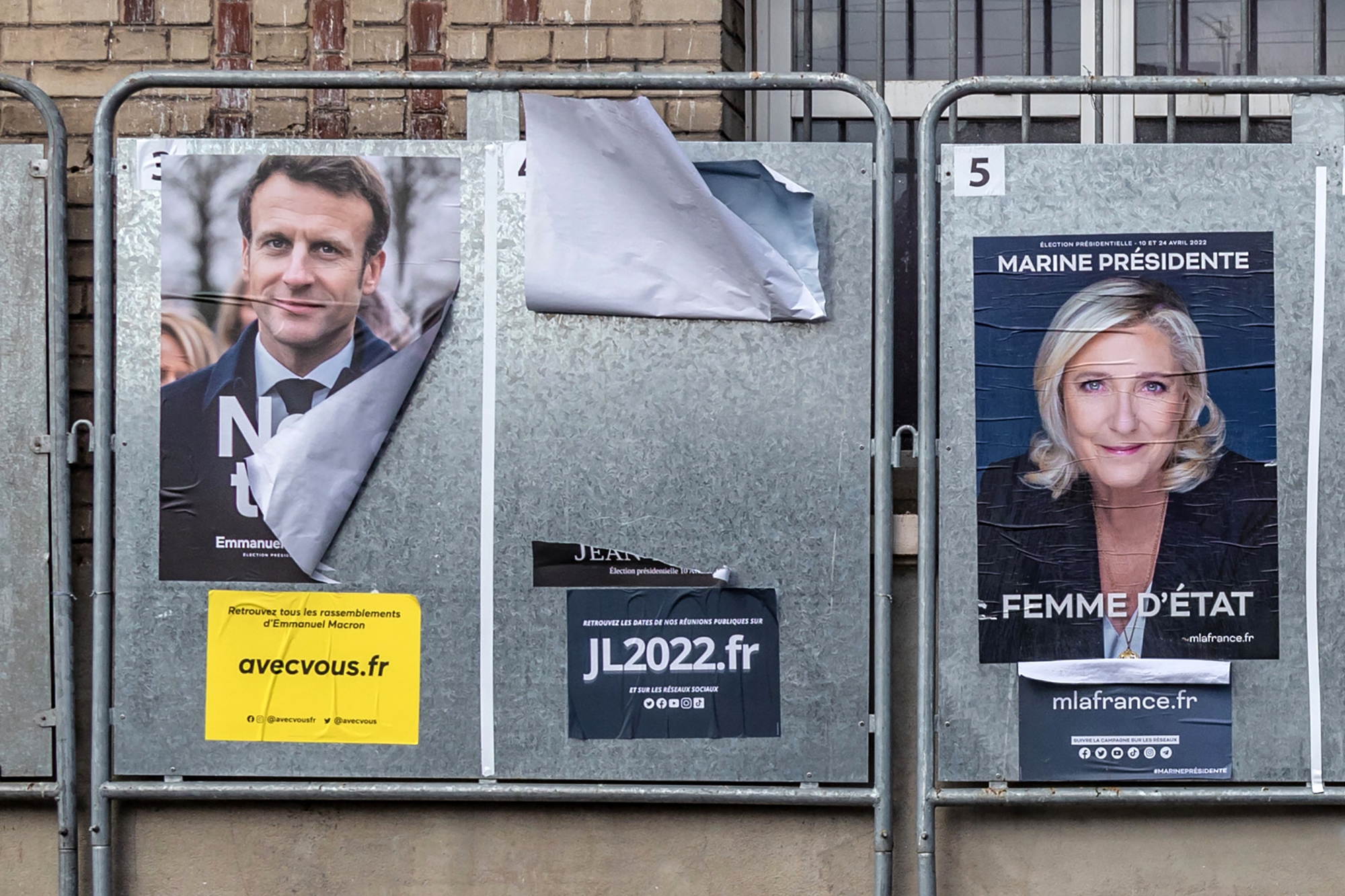 法国总统埃马纽埃尔·马克龙(Emmanuel Macron)和总统候选人玛琳·勒庞(Marine Le Pen)的选举海报挂在法国朗斯的布告板上,日期为2022年4月2日。法国选举可能会考验人们对通货膨胀和经济放缓的不满。