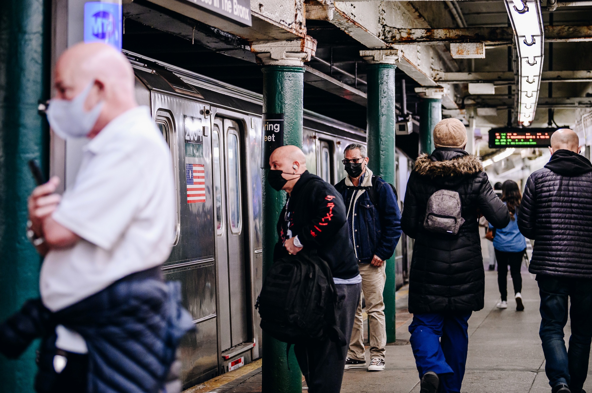 乘客戴着防护口罩在纽约地铁站等待6号列车。